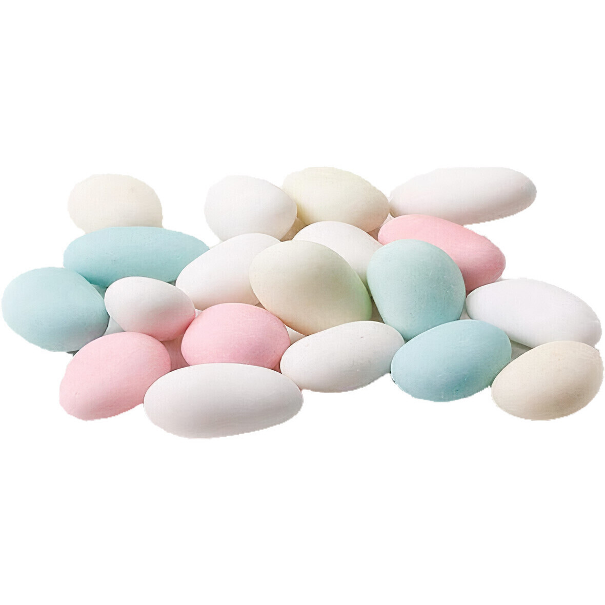 Ingrédients: enrobage de sucre (85 %), (sucre, farine de riz, sirop de glucose, amidon de riz, agent d'enrobage: gomme arabique, colorants: E100, E120, E132) et amandes (15 %).
