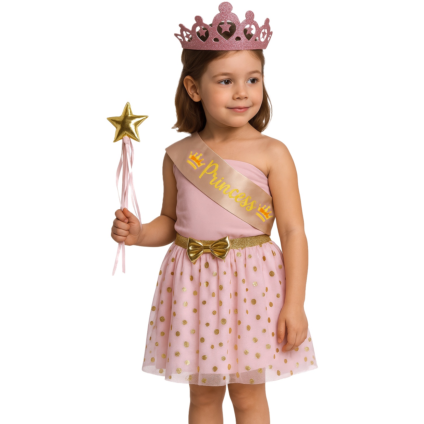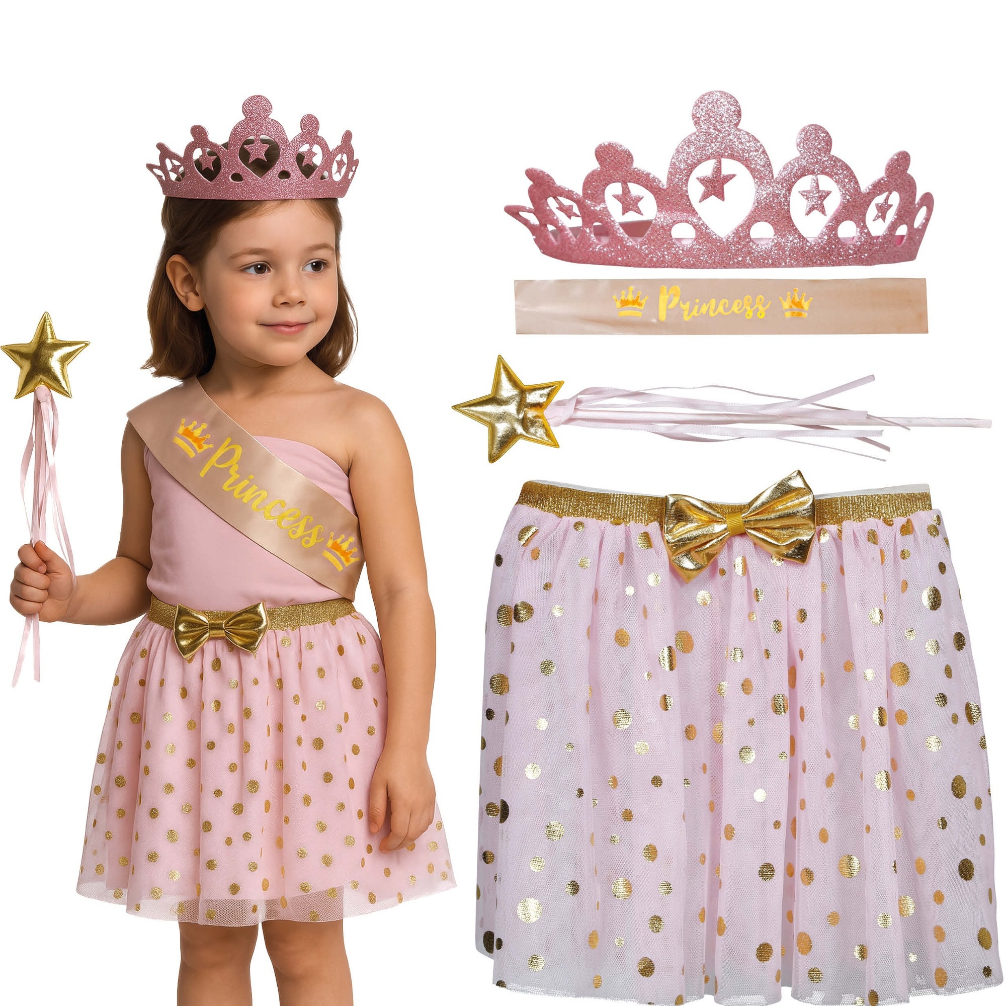 Ensemble princesse enfant avec couronne, écharpe, jupe et baguette