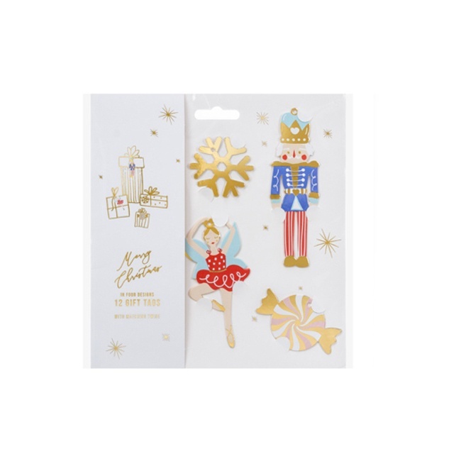 Cet ensemble se caractérise par ses silhouettes distinctives de Casse-Noisette accompagnées d'une ficelle dorée pour les suspendre.