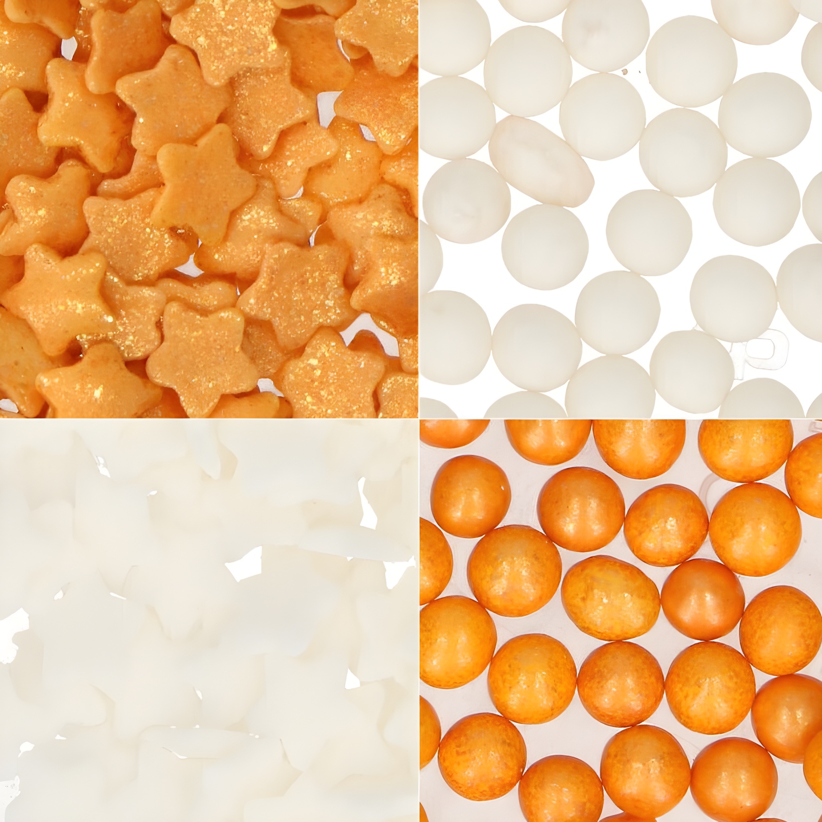 - Perles de sucre blanches, perles de sucre dorées, étoiles dorées et étoiles blanches.