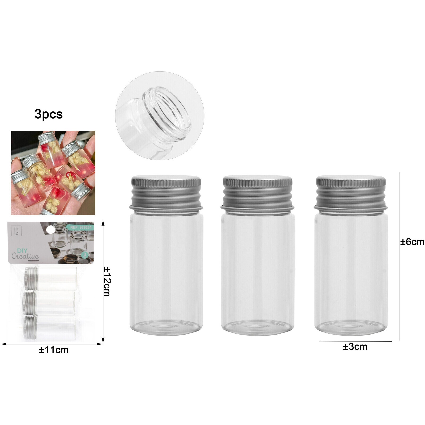 Flacon de 6 x 3 cm en verre avec bouchon métallique - 3 unités