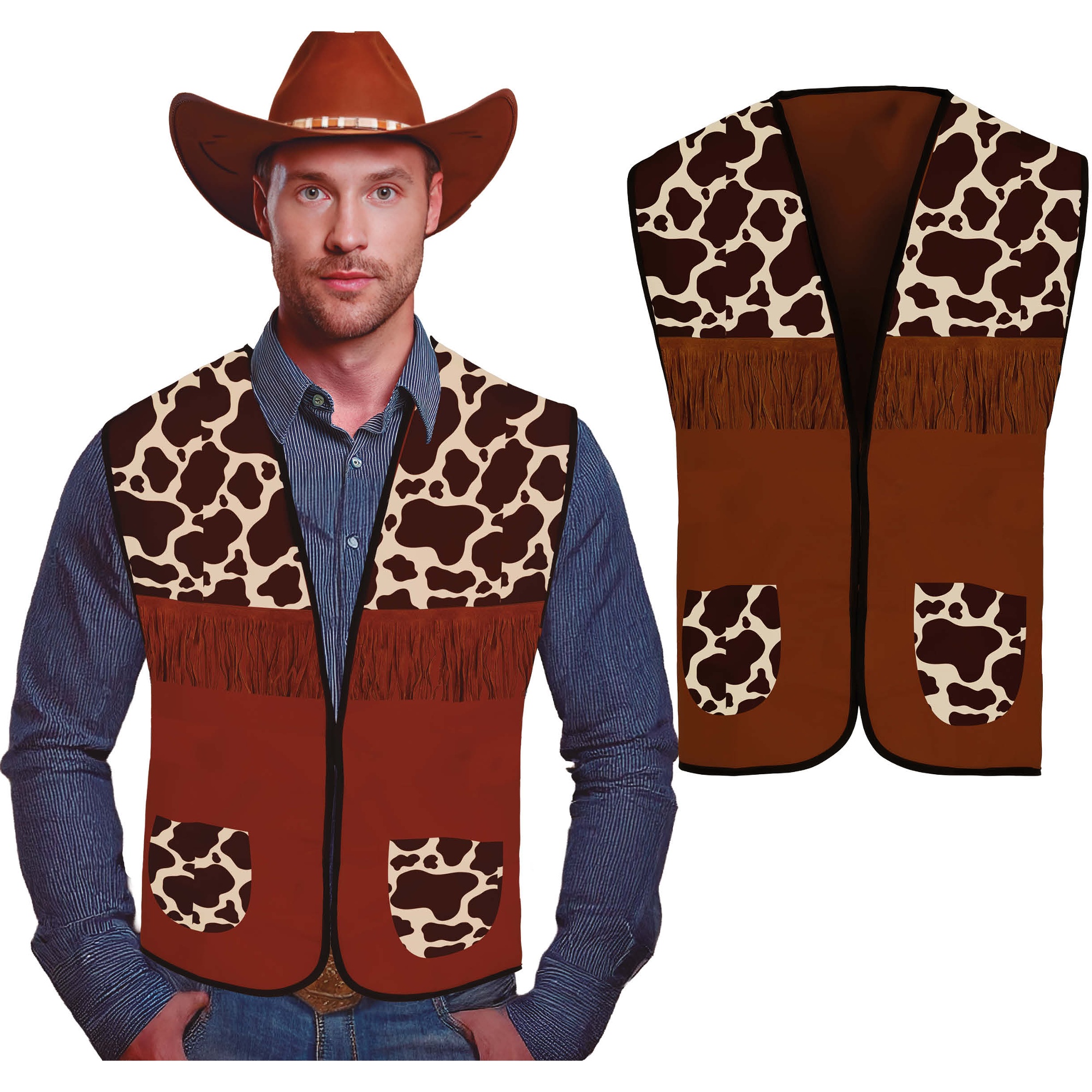 Gilet de cow-boy pour adulte, doté de détails qui évoquent le look classique de l'Ouest. Il présente un imprimé imitation peau de vache sur les épaules et les poches, ainsi qu'une bande de franges décoratives sur la poitrine qui confèrent du caractère à l'ensemble. Confectionné en polyester léger pour un port confortable en tant qu'accessoire de déguisement. Coupe ouverte et finition avec passepoil sombre qui souligne le contraste du design.