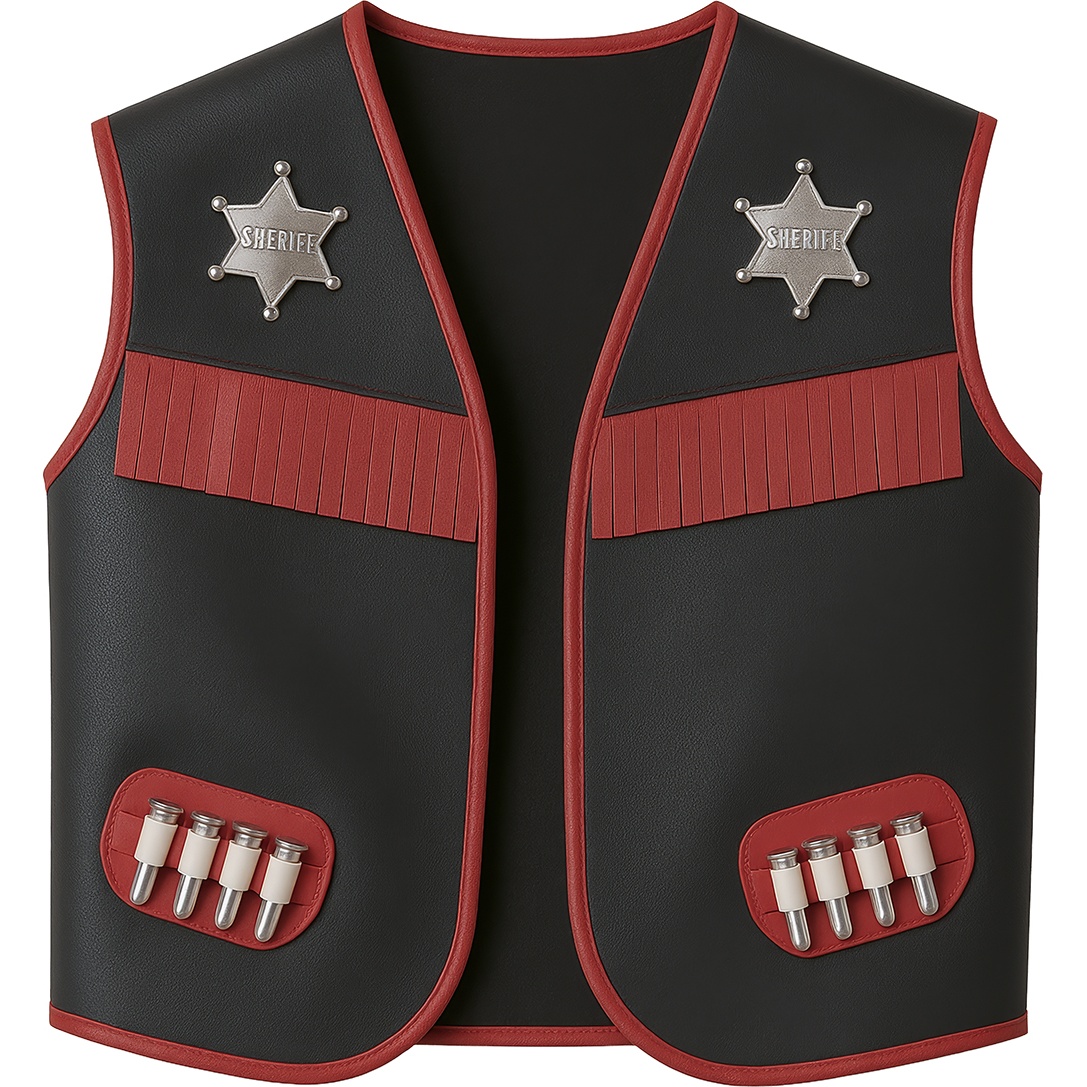 Gilet de cow?boy pour enfant conçu comme accessoire de déguisement et de jeu d'imitation pour votre enfant. Il présente une finition en similicuir avec franges et bordures contrastées qui évoquent l'esthétique du Far West. Il est orné d'une plaque de shérif décorative et de petites cartouchières qui renforcent le look cow?boy. Coupe confortable et ouverte, facile à enfiler pour les plus jeunes ; idéal pour le Carnaval, les fêtes à thème et les activités scolaires.