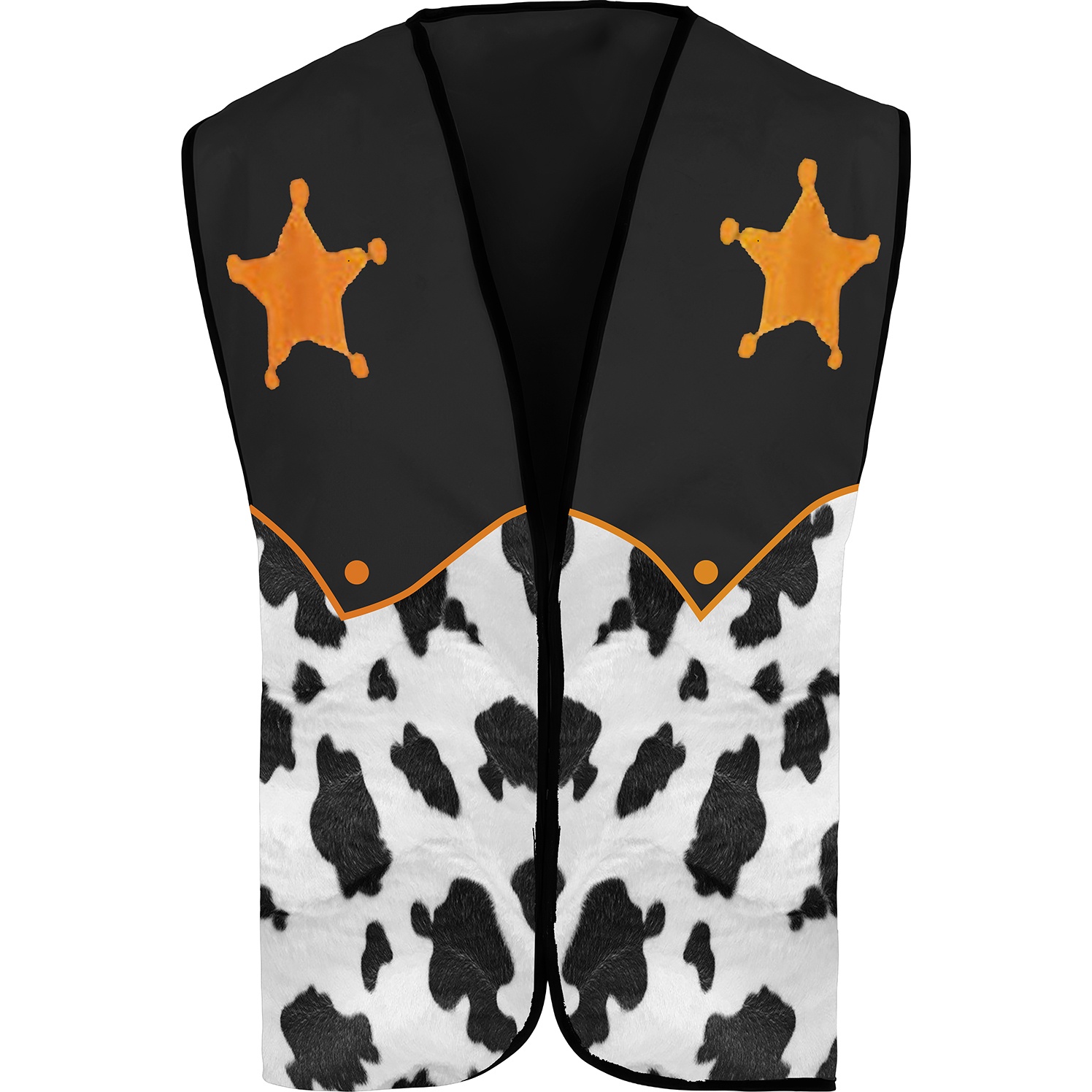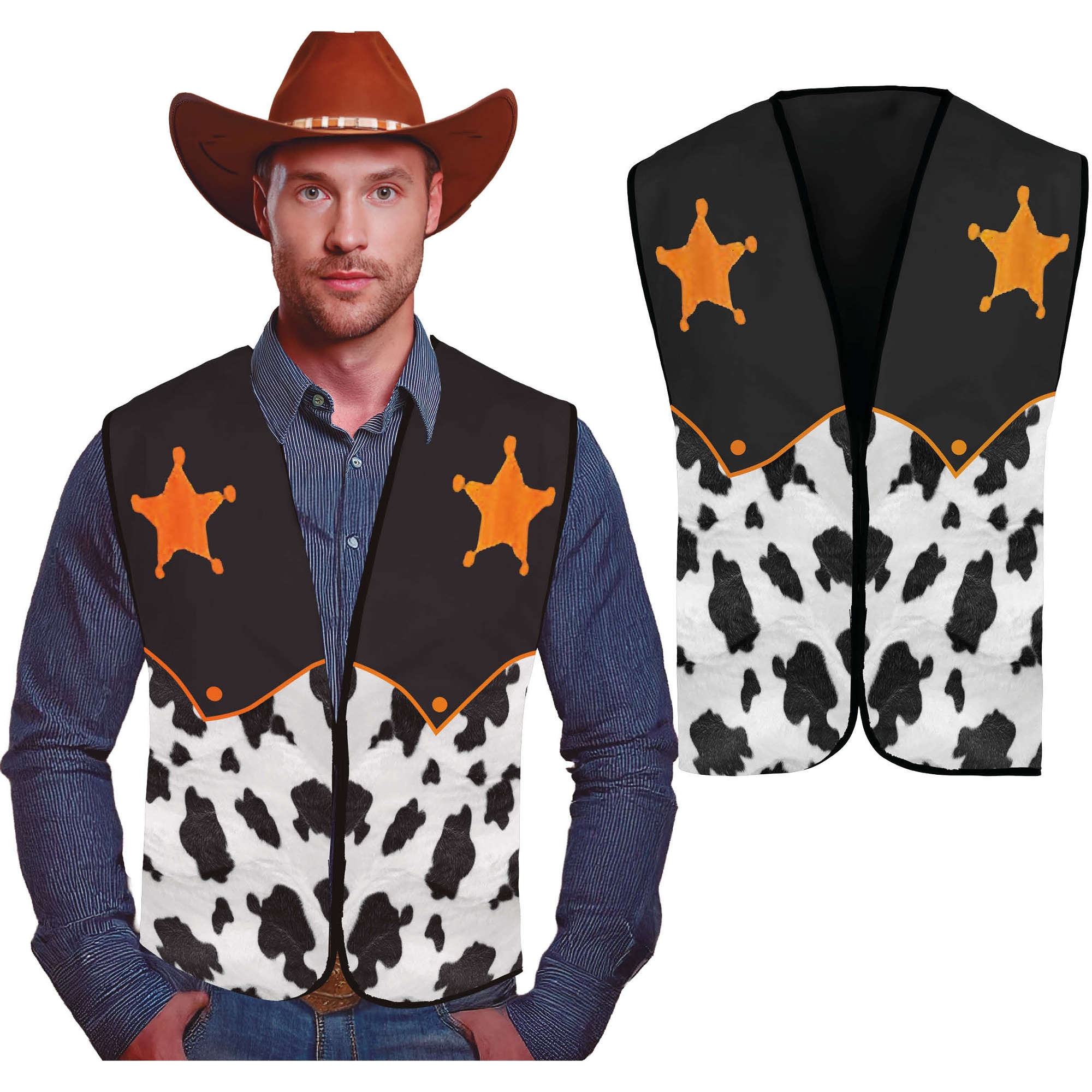 Gilet de shérif au style cow-boy pour adulte, combinant motif peau de vache et étoiles dorées - parfait pour compléter votre tenue western.