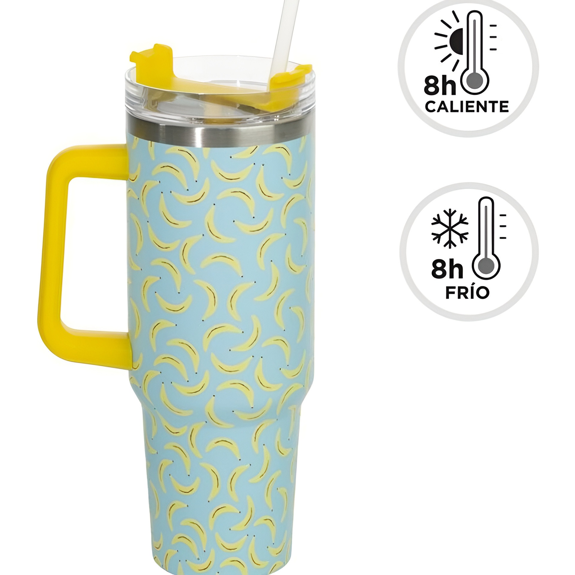 Gobelet isotherme de voyage au motif fruité et ludique. Double paroi en acier inoxydable qui aide à conserver la température jusqu'à 8 heures. Capacité de 1,2 L, anse confortable et bouchon avec ouverture pour paille, conçu pour que vous puissiez boire facilement et réduire les risques de renversement.