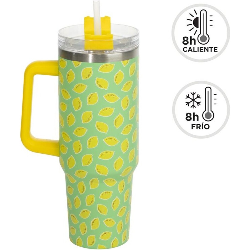 Savourez vos boissons avec un style estival grâce à ce gobelet isotherme au motif citrons. Son design avec anse et couvercle à paille permet de boire confortablement en déplacement, tandis que sa double paroi conserve la température de vos boissons. Idéal à emporter au travail, à la plage ou en excursion, il apportera une touche fraîche et colorée à votre quotidien.