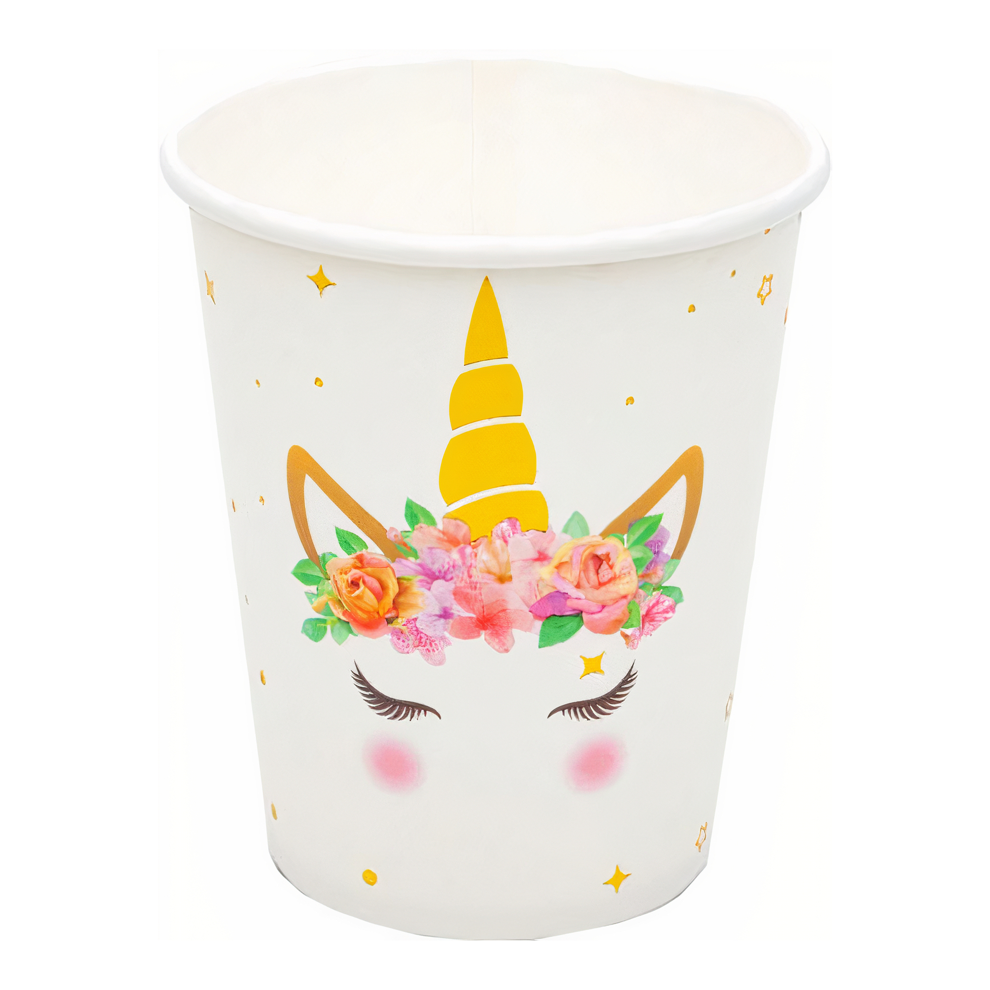 Gobelets en carton au motif licorne, parfaits pour apporter une touche féerique à vos fêtes.