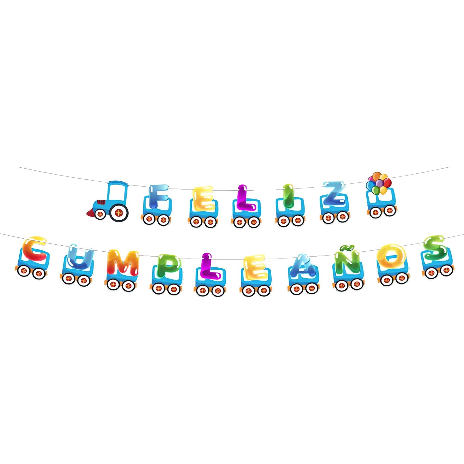 Guirlande enfantine au charmant motif de petit train dont les lettres forment "Feliz Cumpleaños", pensée pour célébrer avec couleurs et joie.