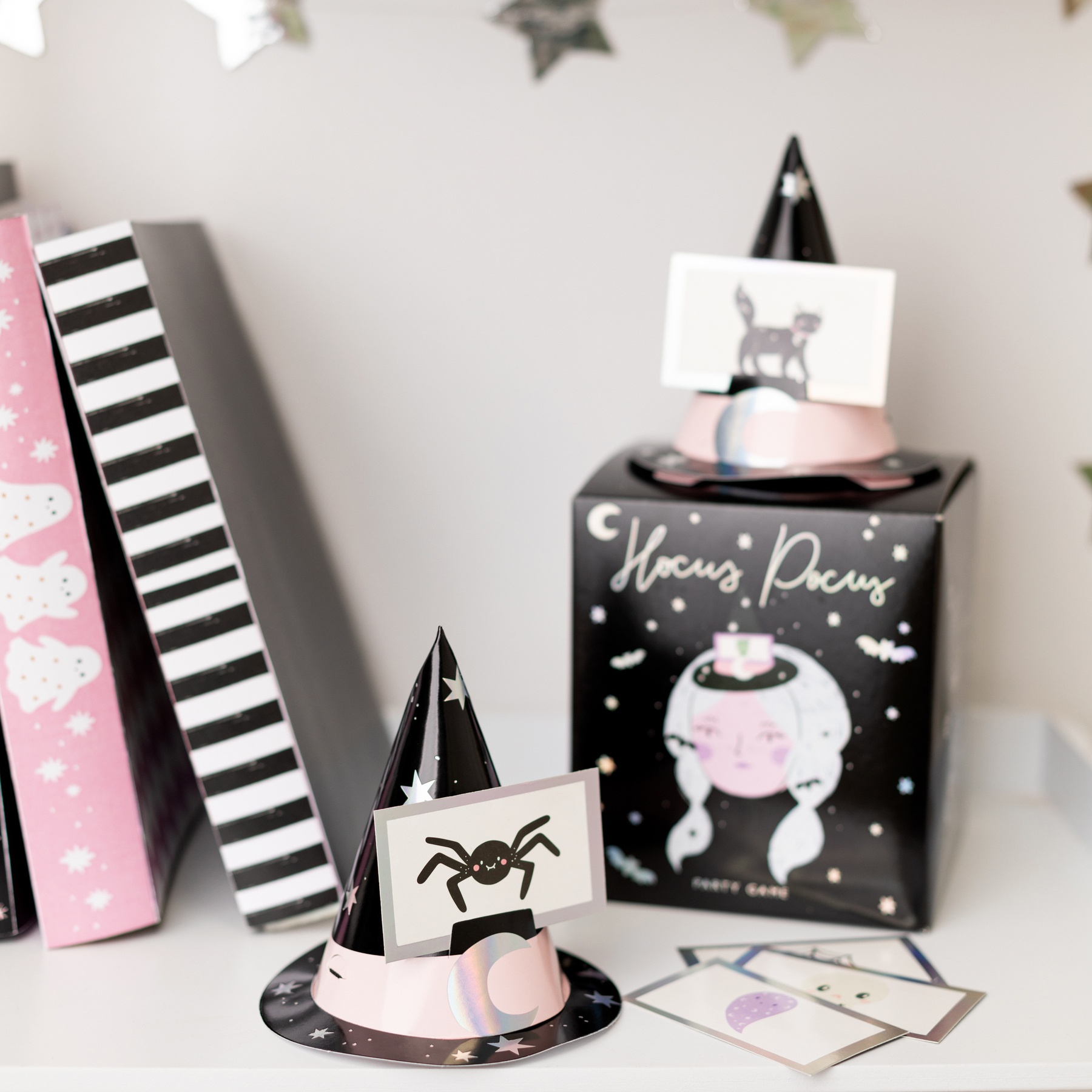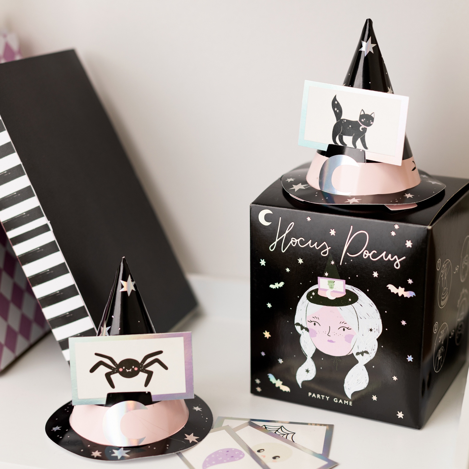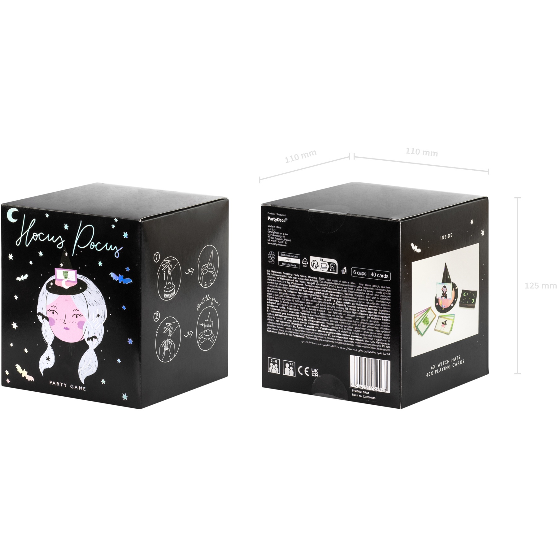 • Inclut: 6 chapeaux de sorcière avec bande élastique et 40 cartes illustrées.