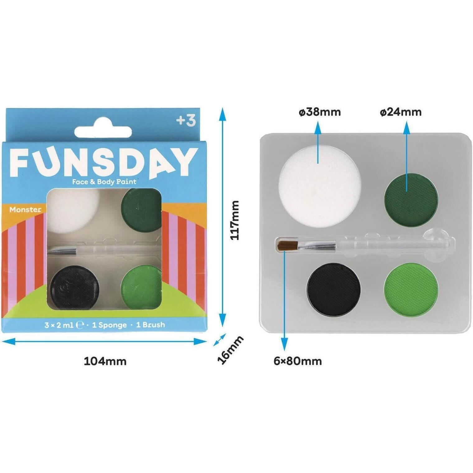 • Kit de 3 peintures pour le visage aux couleurs dinosaure (vert clair, vert foncé et noir) avec pinceau et éponge. Faciles à appliquer, elles offrent un rendu éclatant et durable. Idéal pour vos maquillages de personnage, fêtes, festivals, carnaval ou Halloween.