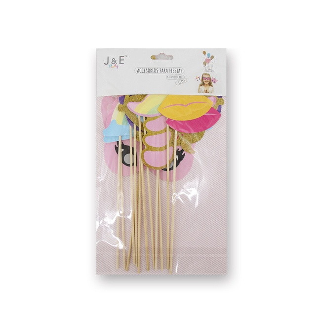 Ce sac contient 12 pièces en carton, peintes d'un côté, fixées à un bâton en bois pour pouvoir les tenir. Les figurines sont: lunettes, arc-en-ciel, couronne, corne de licorne, moustaches, lèvres, têtes de licornes et silhouette de licorne.