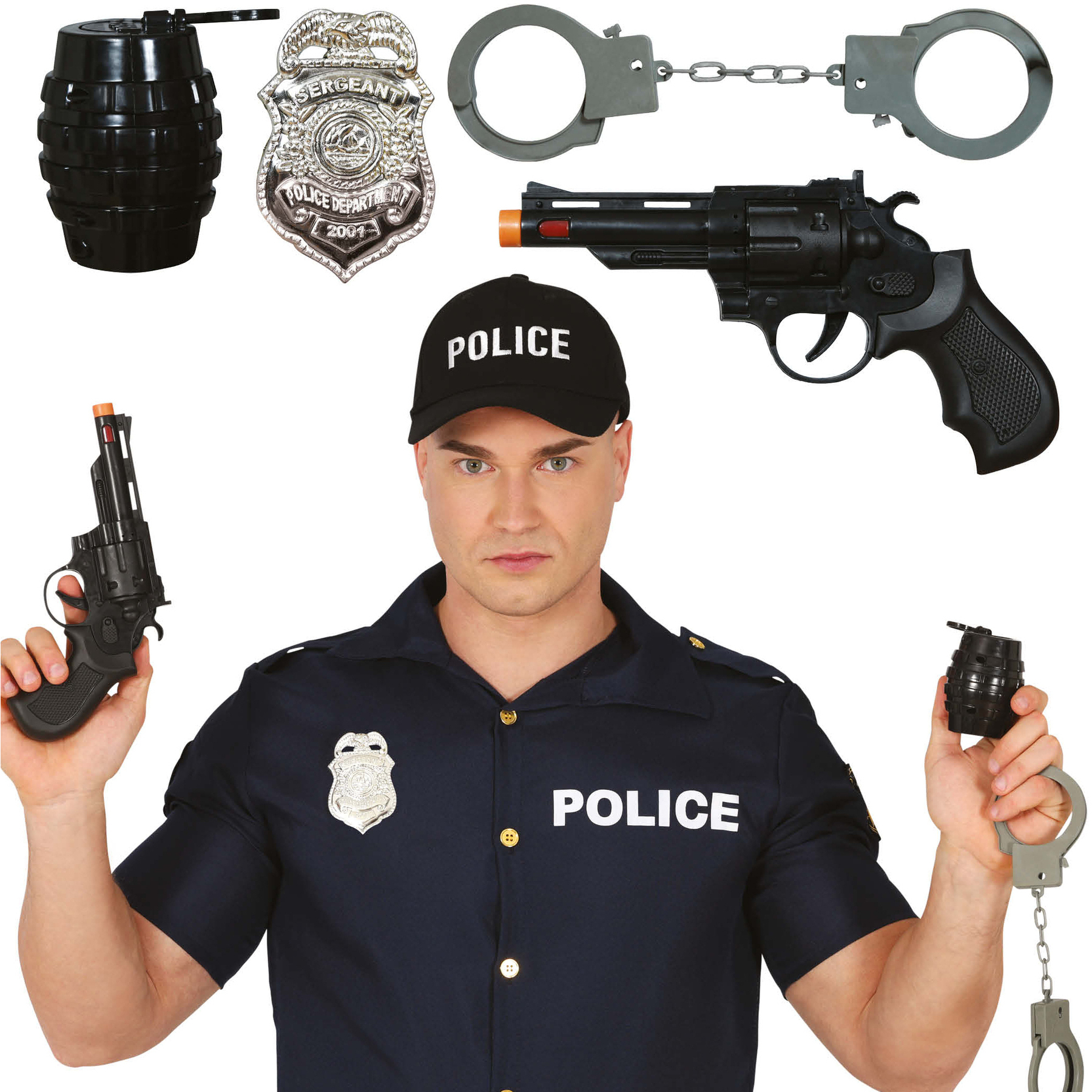 • Comprend: grenade factice, badge, menottes et pistolet-jouet.