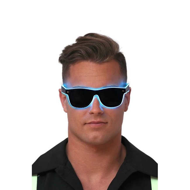 Des lunettes amusantes en pâte de couleur noire avec un verre foncé. Sur le bord, elles ont une lumière bleue.