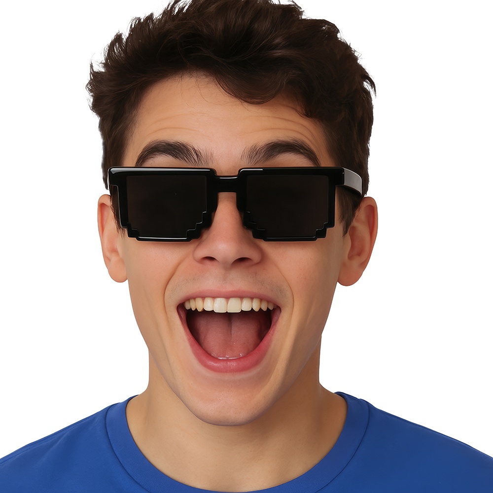 Lunettes Pixel noires au look 8 bits très fun, idéales pour dynamiser vos fêtes et photocalls.