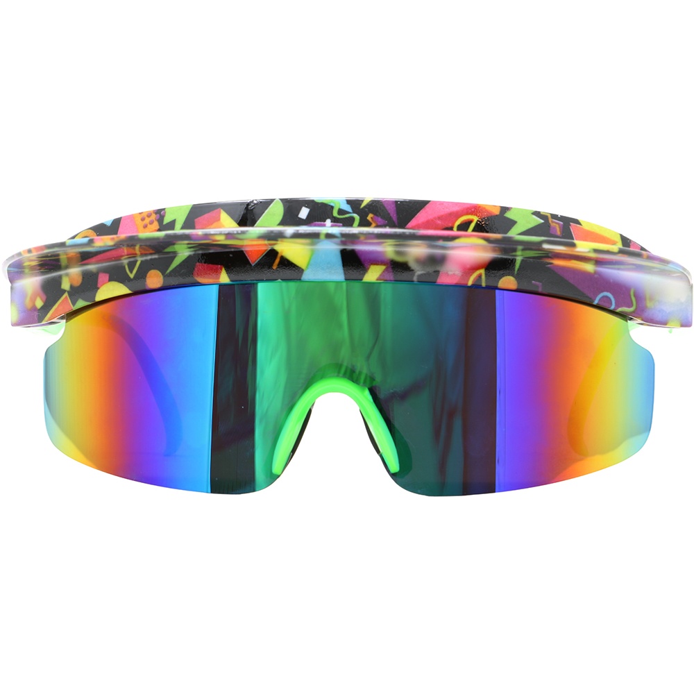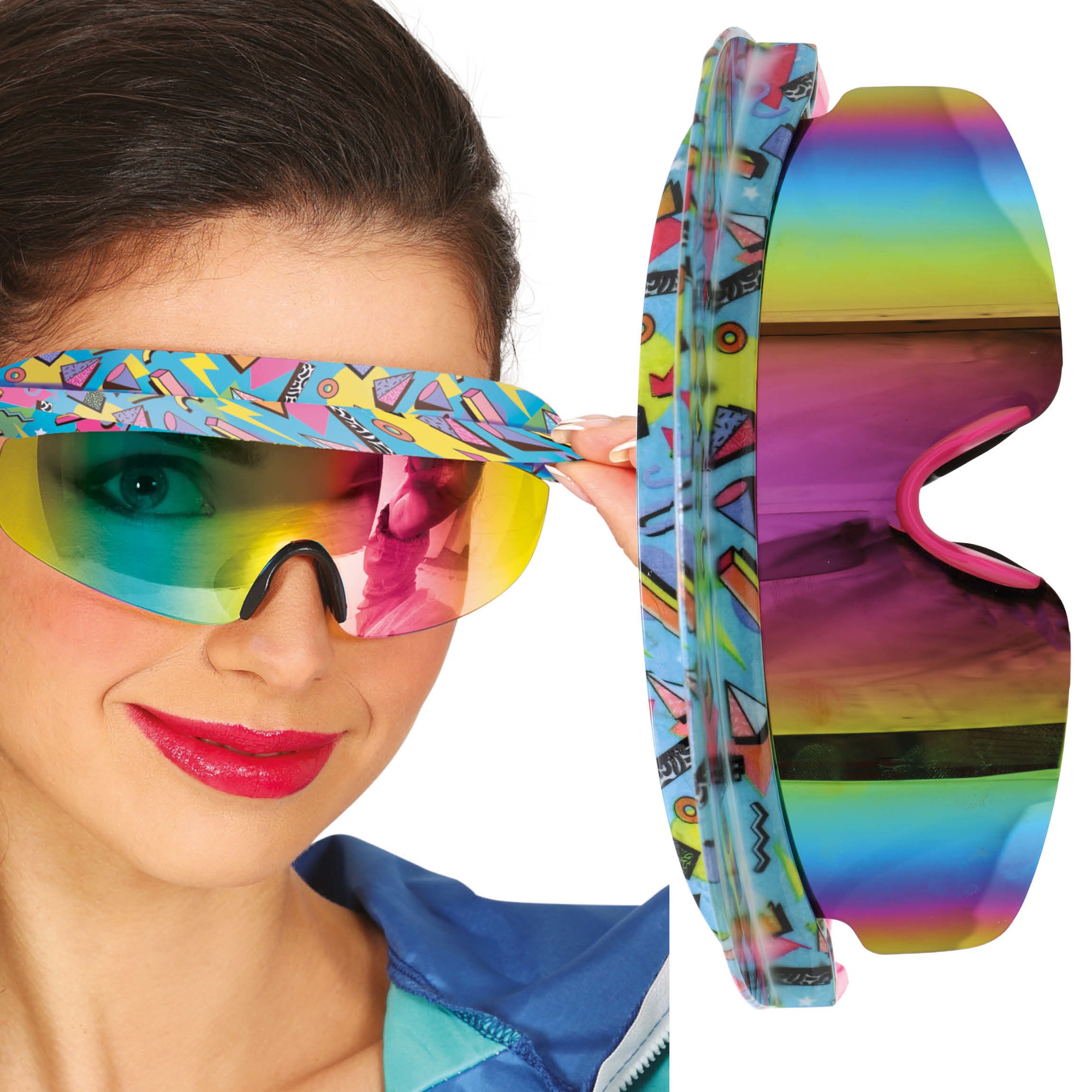 Lunettes 80s au design visière sportif et aux verres miroirs aux couleurs intenses. La monture enveloppante confère un look années 80 immédiat et très accrocheur. Elles disposent d'une sangle élastique réglable pour un maintien sûr et confortable. Légères et ergonomiques, conçues pour être portées pendant des heures sans gêne. Idéales si vous recherchez un accessoire rétro et qui se remarque.