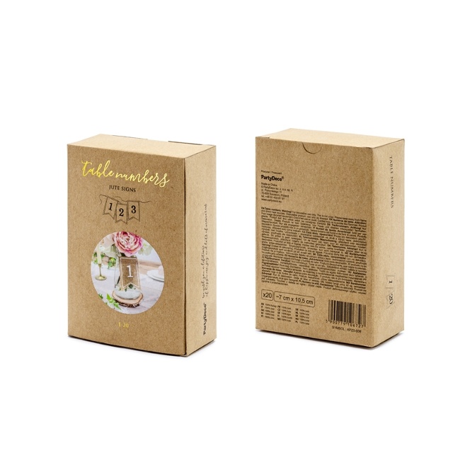 Livrés dans une boîte en carton, ces marqueurs sont composés de 20 panneaux en toile de jute et d'une petite ficelle de la même couleur, conçus pour accueillir des gobelets et autres récipients. Ils sont dotés d'un bord intérieur et d'un numéro blanc.