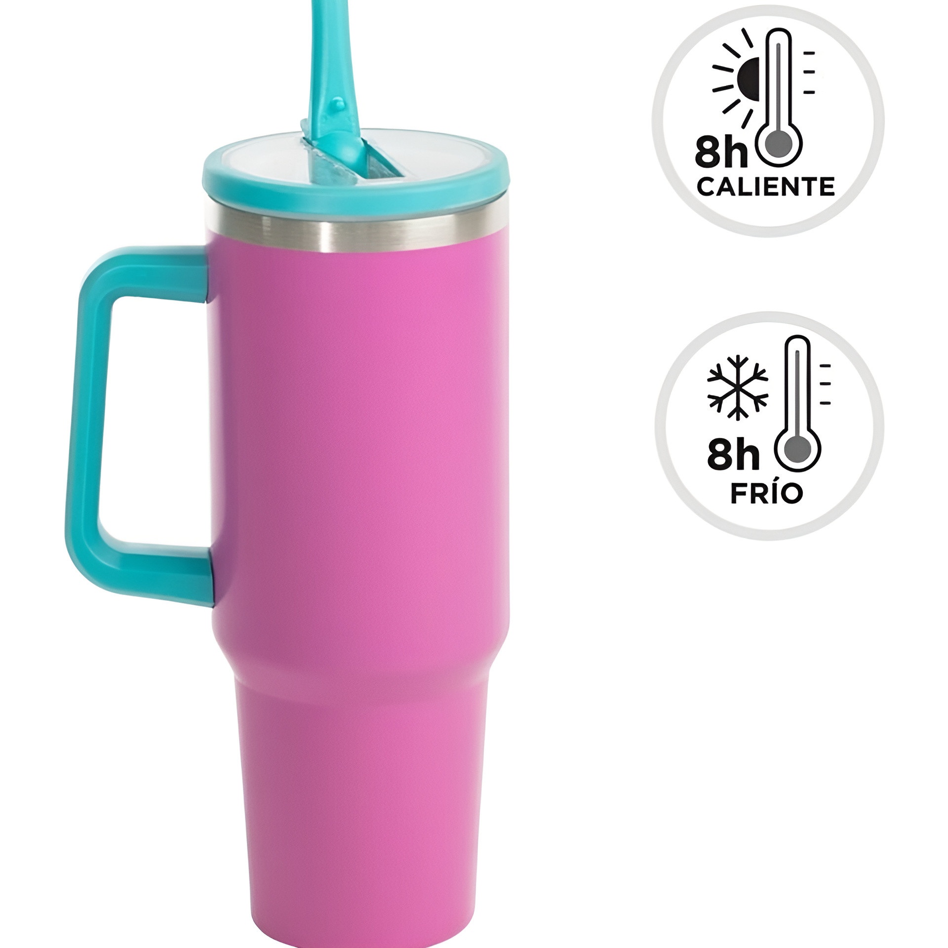Profitez de vos boissons en déplacement avec ce mug isotherme grand format (1,2 L) à double paroi. Conçu en acier inoxydable, il maintient la température de vos boissons pendant des heures et résiste à l'usage quotidien. Le couvercle anti?goutte avec bec et fermeture sécurisée vous permet de boire en voiture ou en voyage sans salir. L'anse ergonomique assure une prise confortable et le profil haut et étroit s'adapte à la plupart des porte?gobelets. Sa finition magenta fluo, rehaussée d'éléments turquoises, lui confère un style moderne et facilite son repérage.