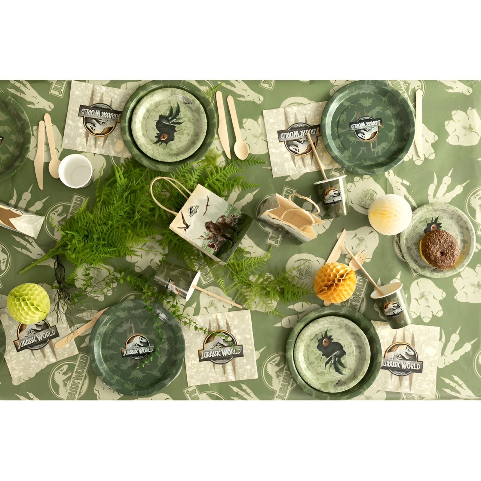Nappe jetable Jurassic World en tons verts, imprimée d'empreintes, de crânes et du logo officiel. Elle crée une ambiance colorée et thématique pour vos fêtes d'enfants. Sa dimension dépliée est de 180 x 120 cm, idéale pour les tables rectangulaires. Produit à usage unique conçu pour vous faciliter la décoration de vos événements inspirés de l'univers Jurassic World.