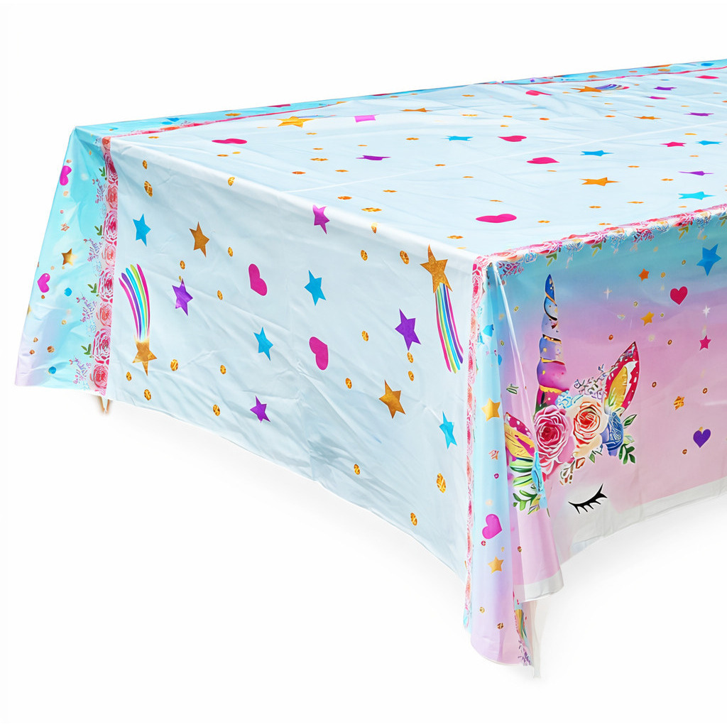 Apportez une touche féerique à votre table: cette nappe licorne à fleurs, aux couleurs pastel et aux motifs étoiles et coeurs, est idéale pour anniversaires et fêtes.