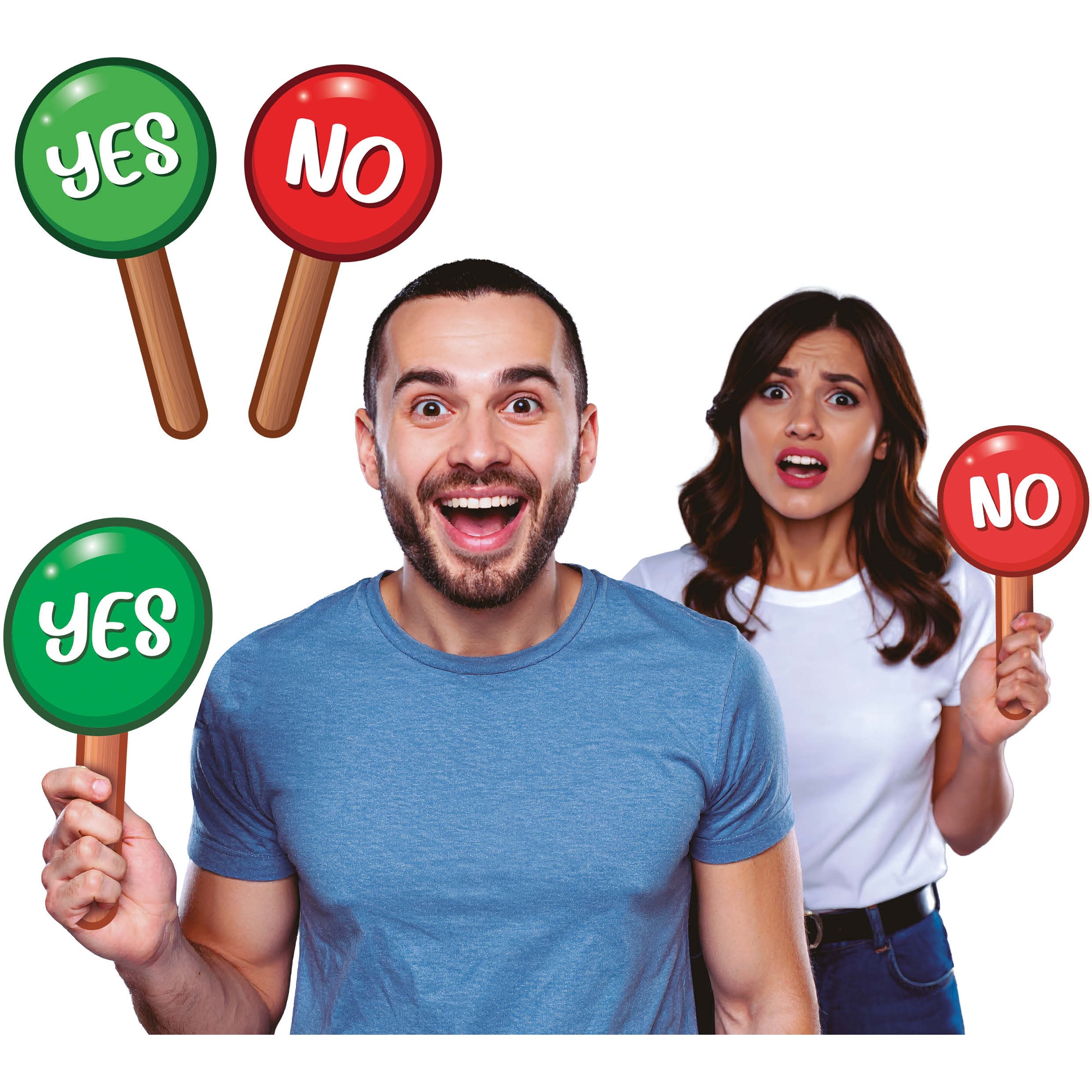 Pancartes "Yes" et "No" à main, conçues pour ajouter une touche expressive et amusante à vos photos et animations lors d'événements. Imprimées sur papier aux couleurs vives et avec une typographie claire pour une lisibilité optimale. Format pratique de 13 x 25 cm, légères et agréables à tenir. Leur design facilite les réponses rapides et dynamise les photobooths, les mariages, les anniversaires et les réunions.