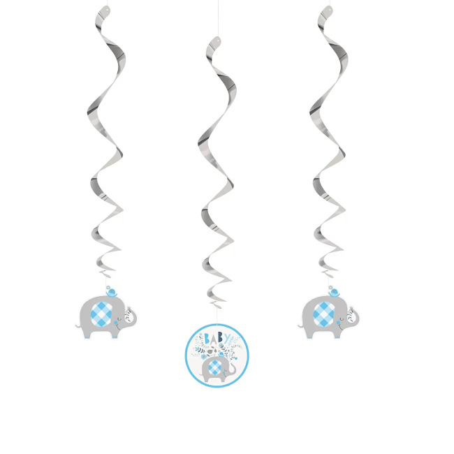Décoration pour fêtes d'enfants ou baby shower, dans des teintes douces de bleu. Les suspensions sont composées de 3 pièces avec deux motifs différents, que vous pouvez combiner avec d'autres éléments disponibles de la même décoration.