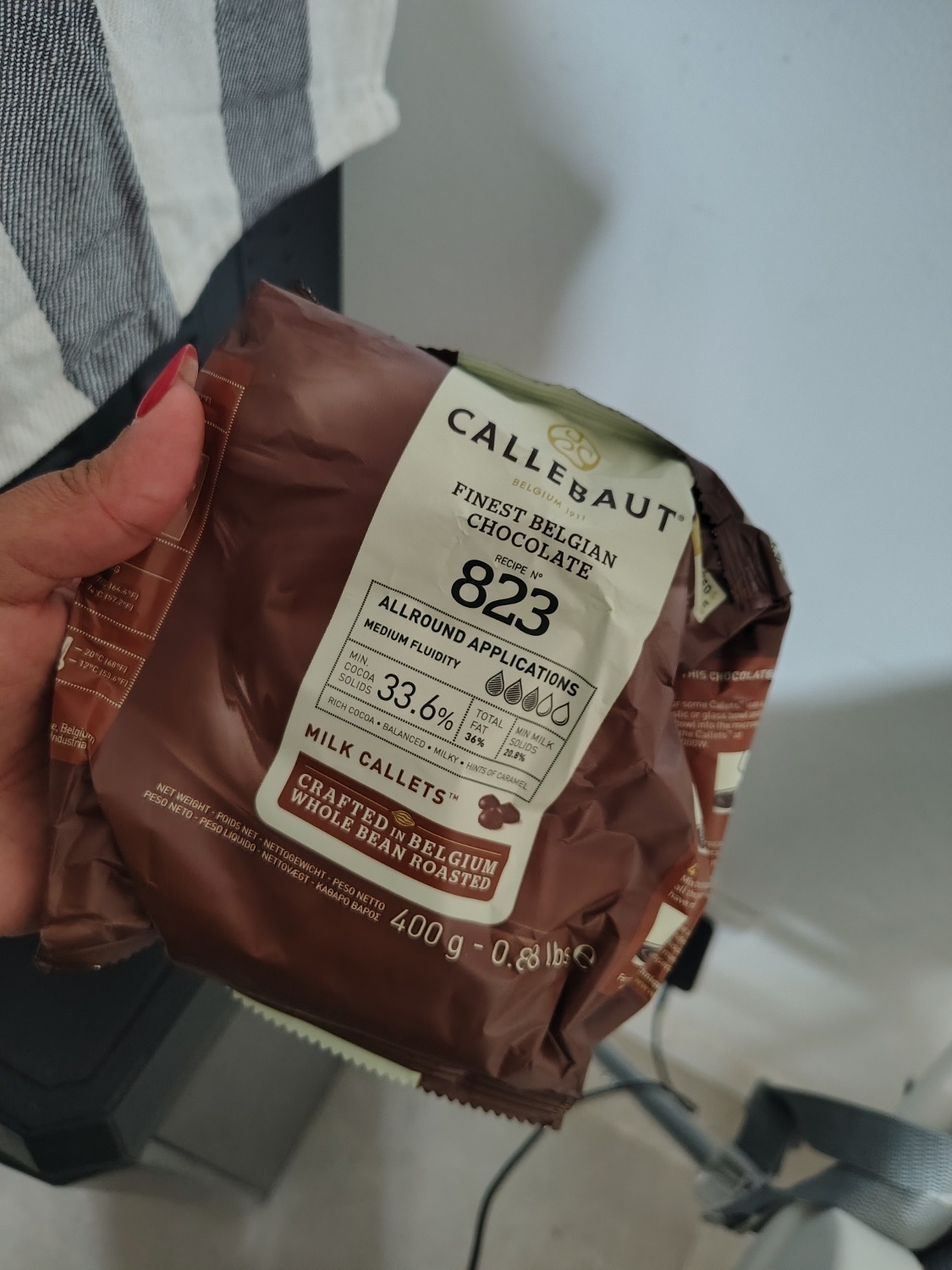 - Le chocolat au lait en callets contient 33,6 % de cacao et est fabriqué avec le meilleur chocolat belge.