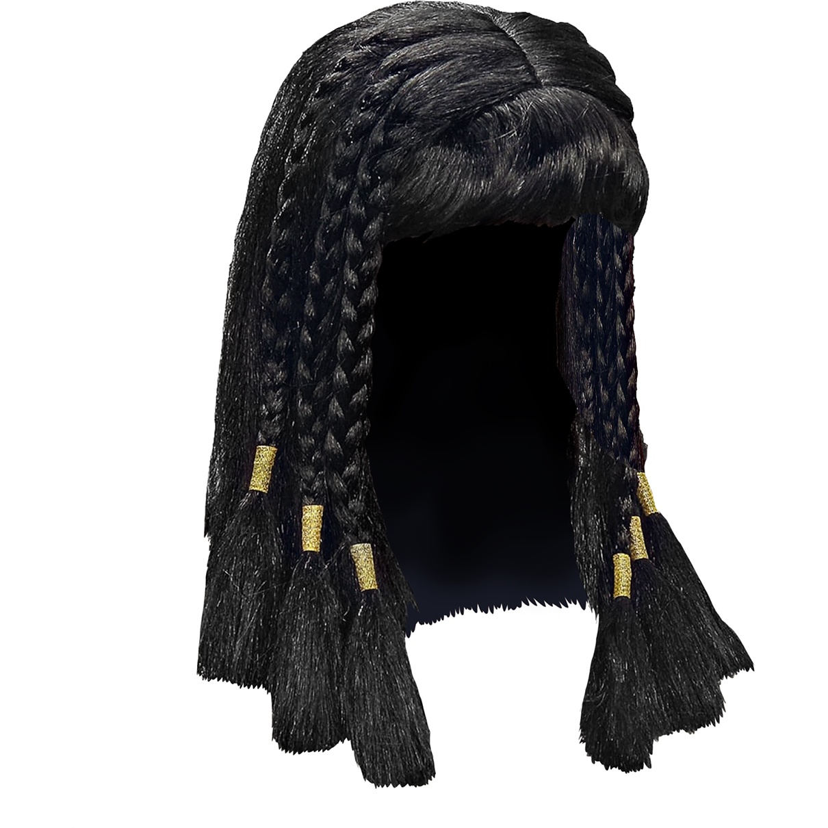 Adoptez un look authentique de reine du Nil avec cette perruque Cléopâtre conçue pour femme adulte. Elle présente une frange droite et des mèches longues avec tresses latérales décorées de détails dorés qui renforcent le style égyptien classique. Son volume et sa chute apportent une finition dramatique et élégante, idéale pour toute reconstitution historique ou représentation théâtrale. Taille unique pensée pour s'adapter confortablement à la plupart des tours de tête adultes.