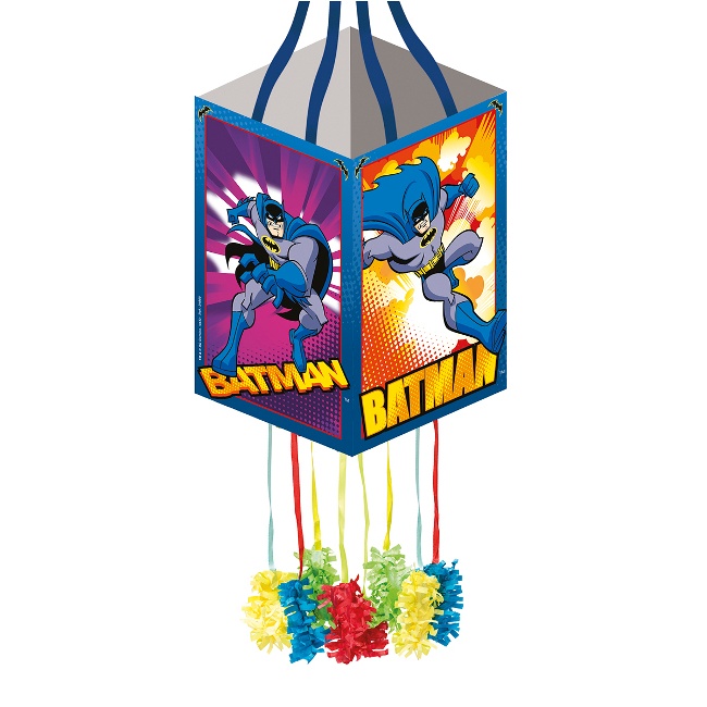 Une piñata carrée imprimée sur toutes les faces, chacune avec un design différent du super-héros Batman.