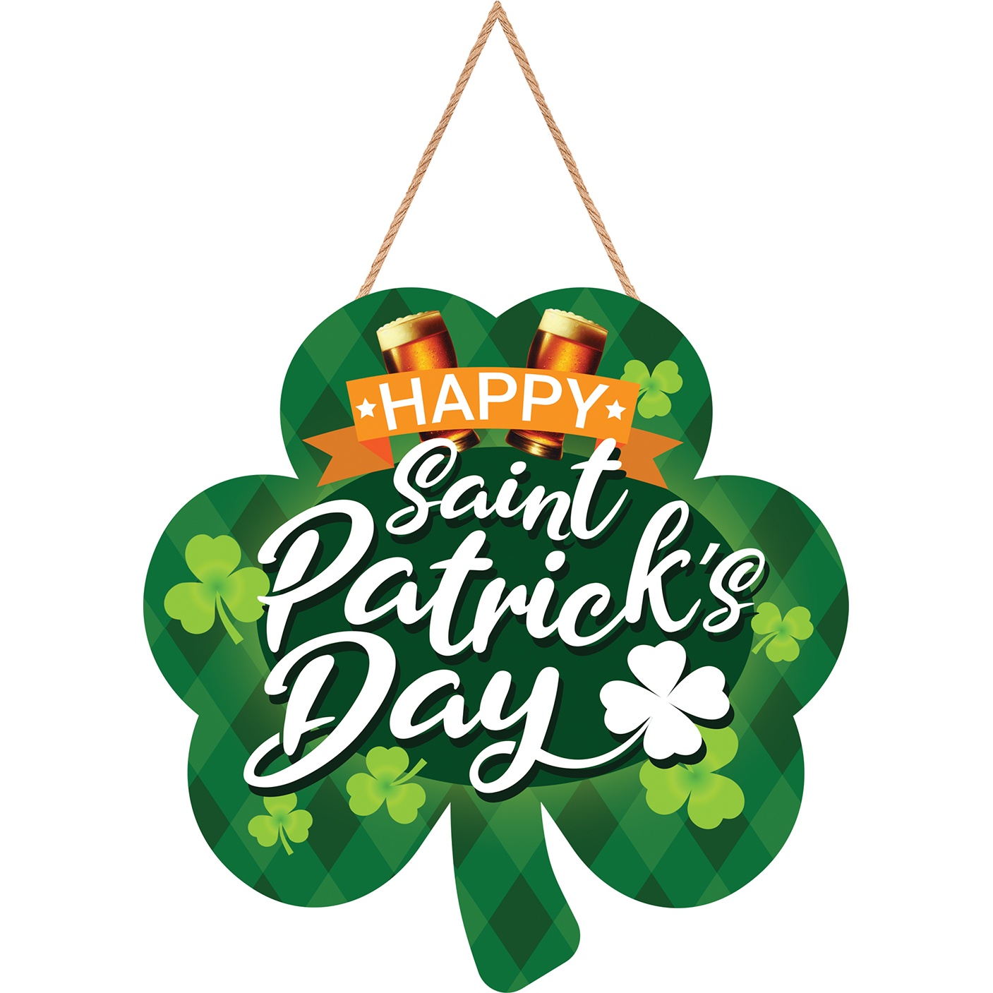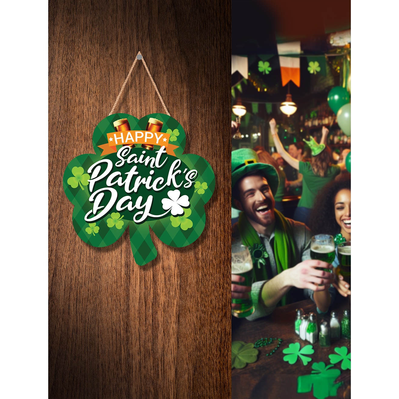 Ambiance festive instantanée. Plaque décorative en forme de trèfle portant l'inscription "Happy Saint Patrick's Day", parfaite pour apporter couleur et caractère à vos fêtes et espaces thématiques.