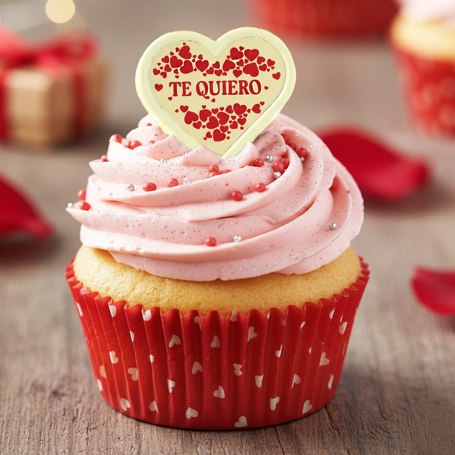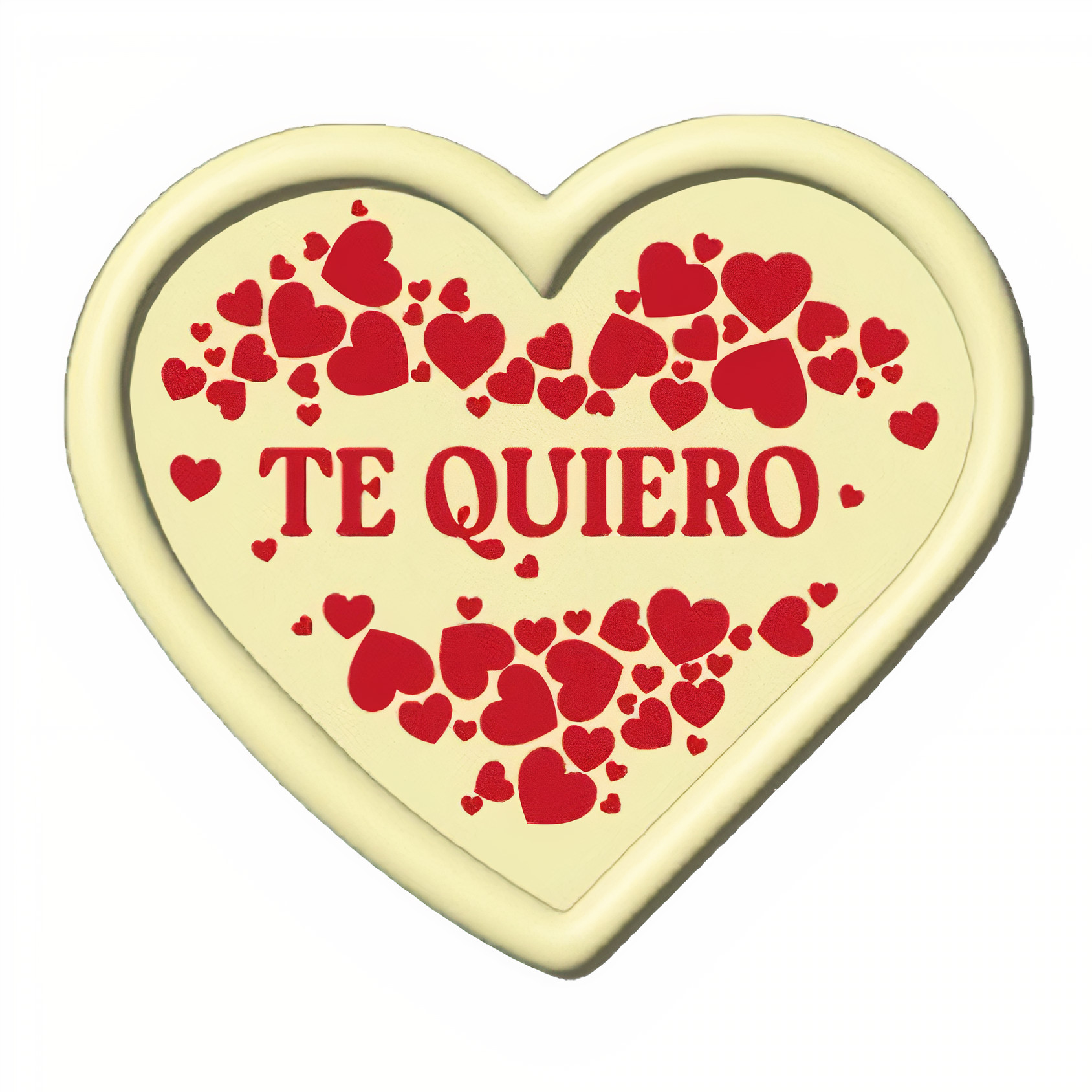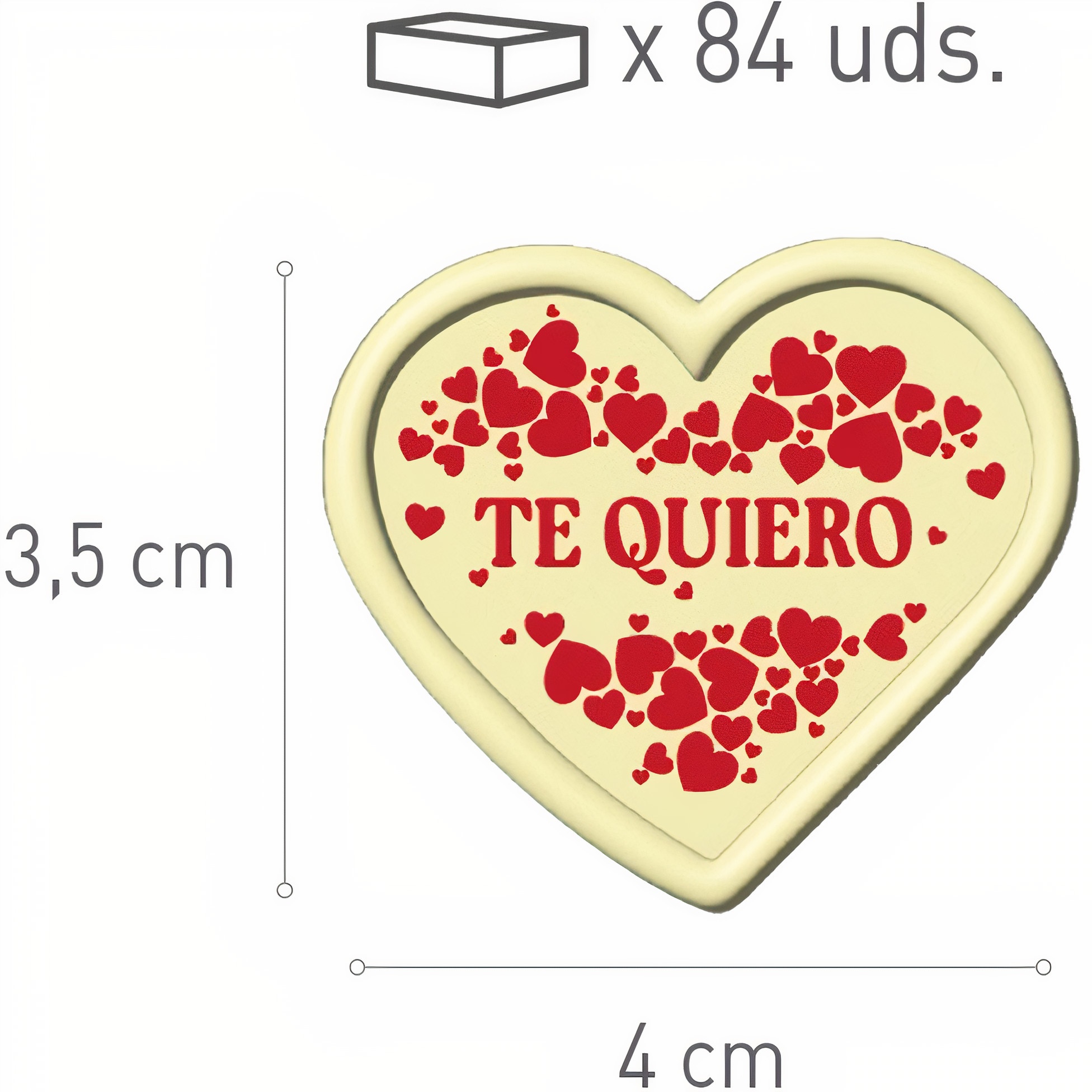 • 84 décorations en chocolat blanc en forme de coeur, imprimées avec message.
