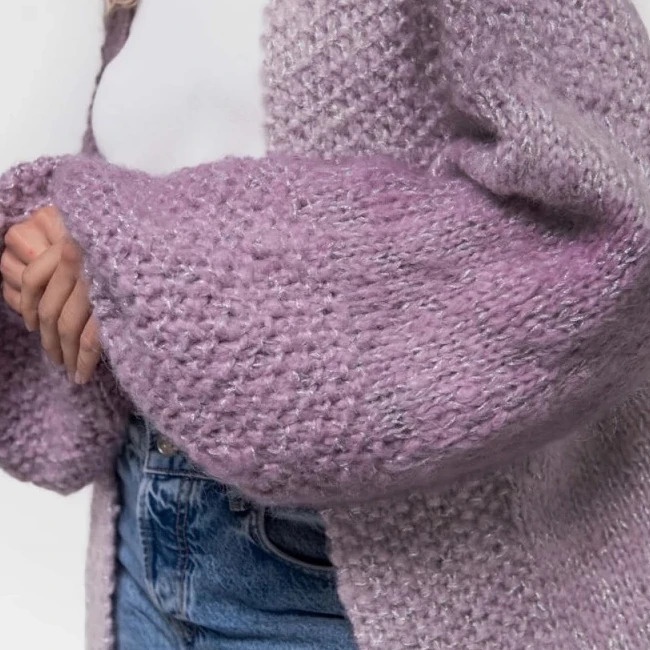 • Vous trouverez les explications pour tricoter un cardigan avec des bords larges et un haut en point de riz, orné de manches bouffantes et de point de riz sur les poignets.