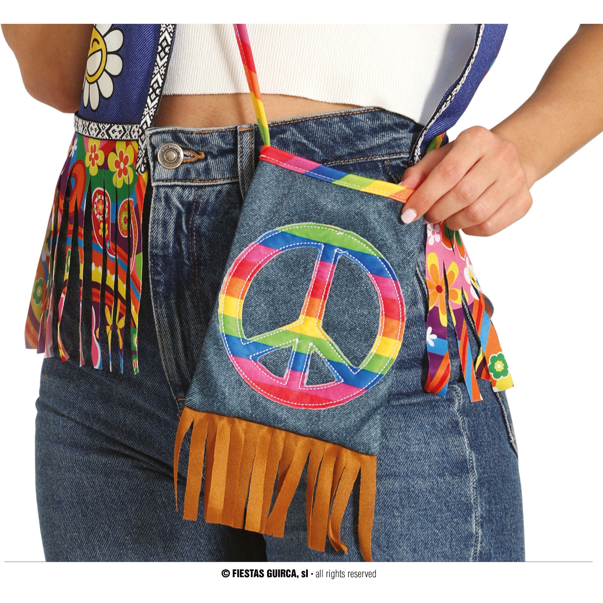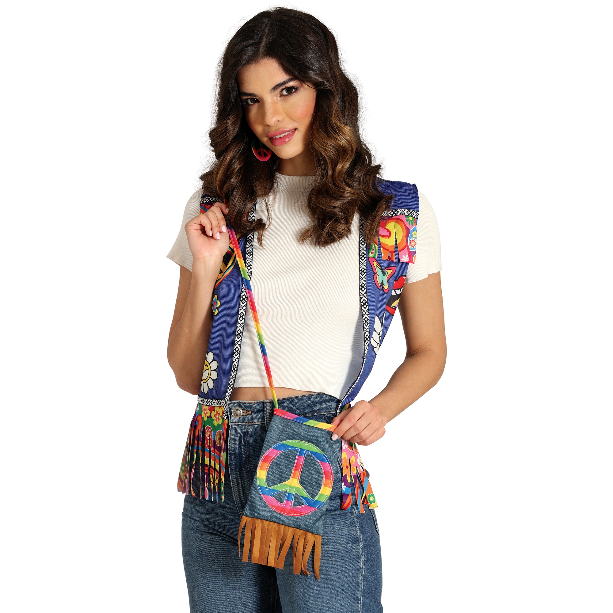 Accessoire idéal pour un look hippie ou un déguisement. Sac bandoulière au style rétro, orné d'un patch du symbole de la paix aux couleurs vives et de franges sur le bas. Confectionné en polyester résistant et facile à nettoyer. Format compact 27 x 15 cm, parfait pour transporter l'essentiel lors de vos soirées, carnavals ou festivals. Bandoulière permettant un port à l'épaule ou en travers, pour plus de confort et une touche bohème à votre tenue.