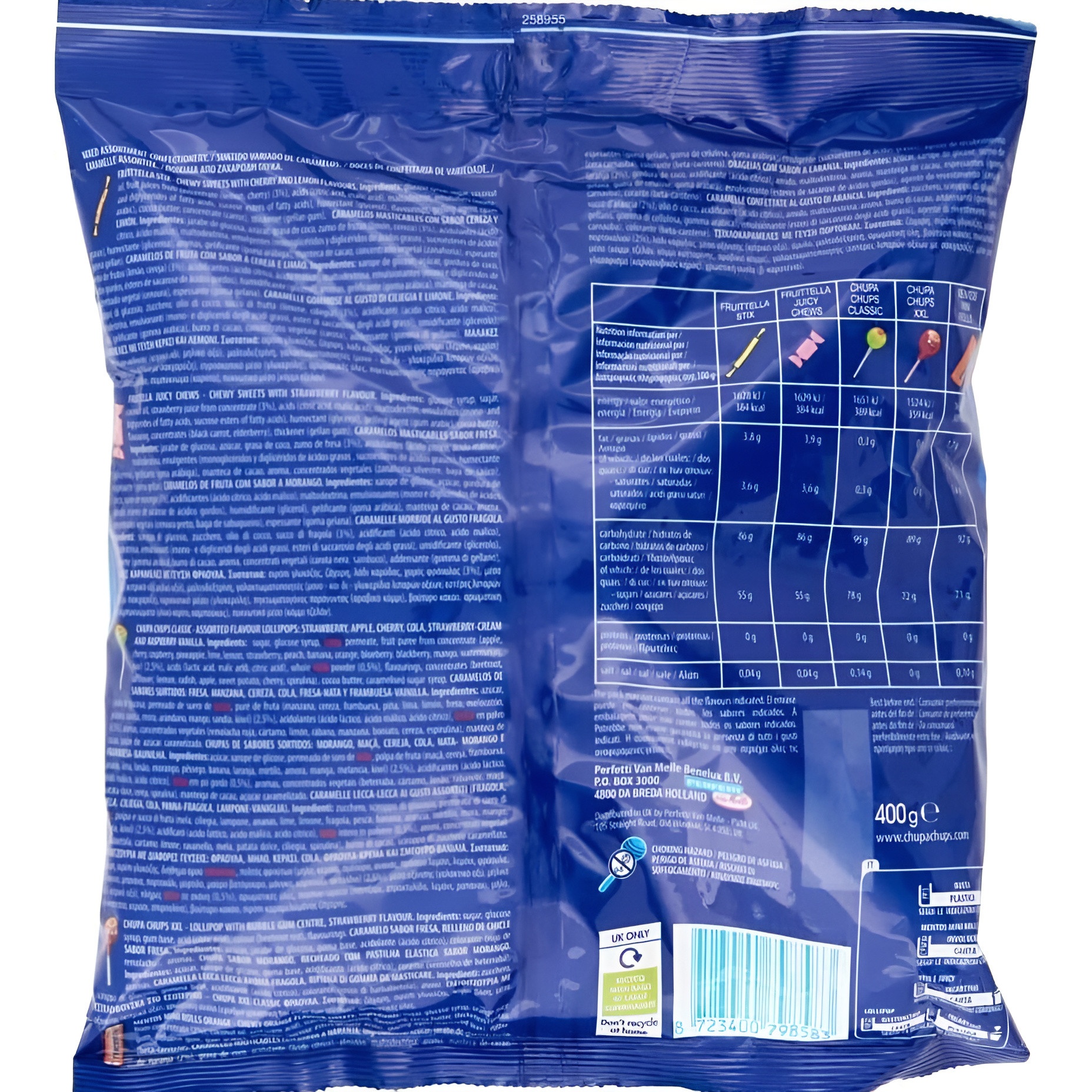 - Comprend: bonbons à mâcher saveur cerise et citron (Fruittella Stix), bonbons à mâcher saveur fraise (Fruittella Juicy Chews), sucettes assorties (Chupa Chups Classic), sucettes fourrées au chewing-gum saveur fraise (Chupa Chups chicle), Mentos saveur orange (Mentos Mini Rolls Orange).