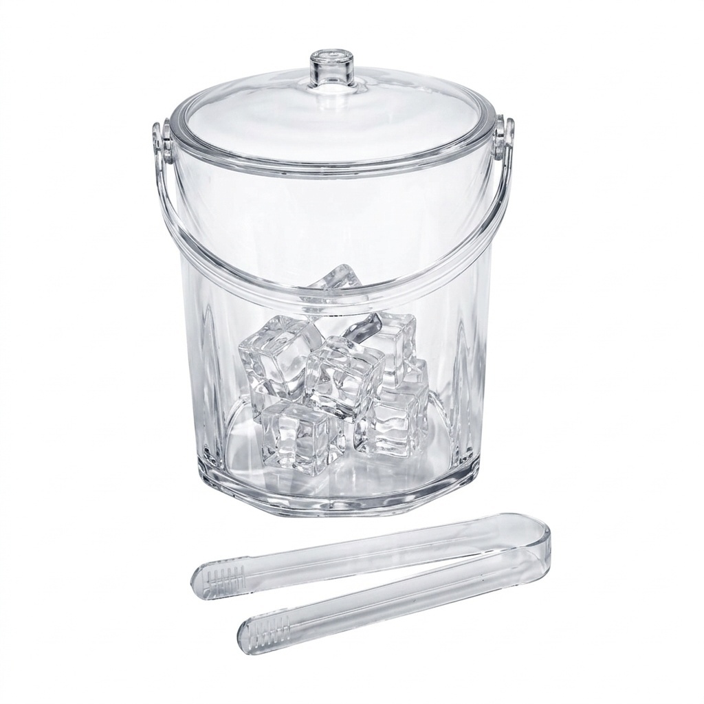 Seau à glaçons transparent en acrylique avec pinces, conçu pour servir les glaçons avec style et praticité.