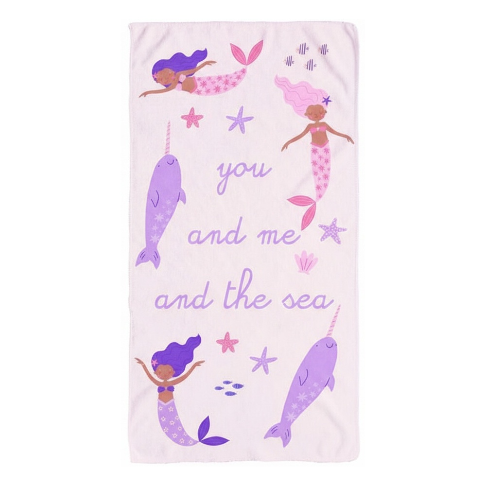Serviette pour enfant au motif joyeux de sirènes et de narvals dans des tons rose et lilas. Conçue pour accompagner les aventures de votre enfant à la plage et à la piscine, elle apporte une touche ludique et colorée. Ses dimensions sont idéales pour les enfants d'âge scolaire et son design en fait un cadeau d'anniversaire parfait.