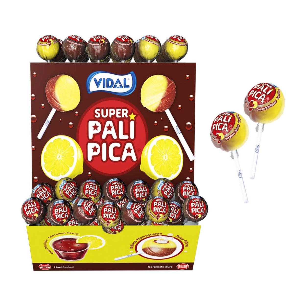 Pack pour fêtes et points de vente: sucettes attrayantes et acidulées avec bâtonnet et coeur de chewing-gum combinant des saveurs pétillantes cola et citron. Parfait si vous êtes audacieux, il offre une explosion de saveurs avec une texture mâchable à l'intérieur et un enrobage acidulé vibrant.