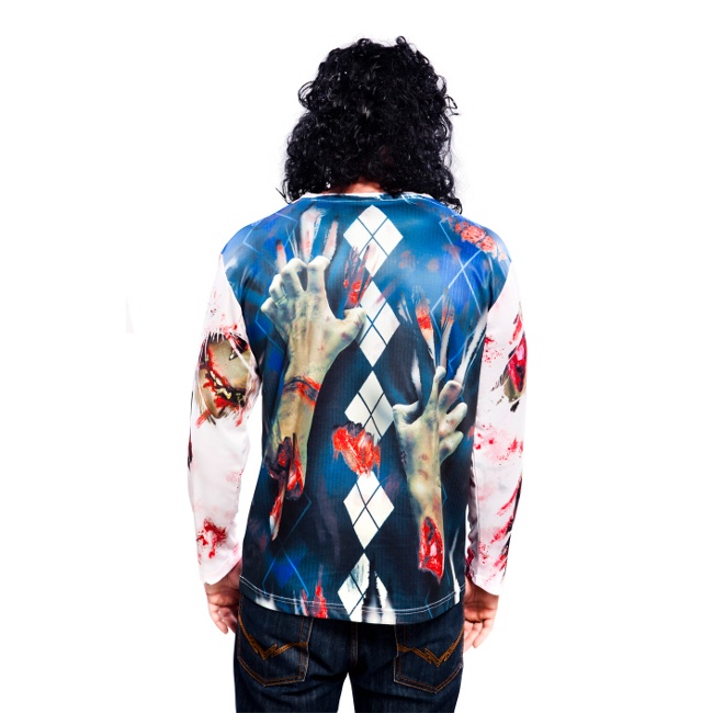 Le t-shirt bleu à motif losange a des manches de couleur blanche ainsi que le col. Il présente de nombreux détails sanglants d'un grand réalisme tant sur les bras que sur le corps, ainsi que deux mains qui griffent le dos ; vous pouvez voir l'effet sur la photo.