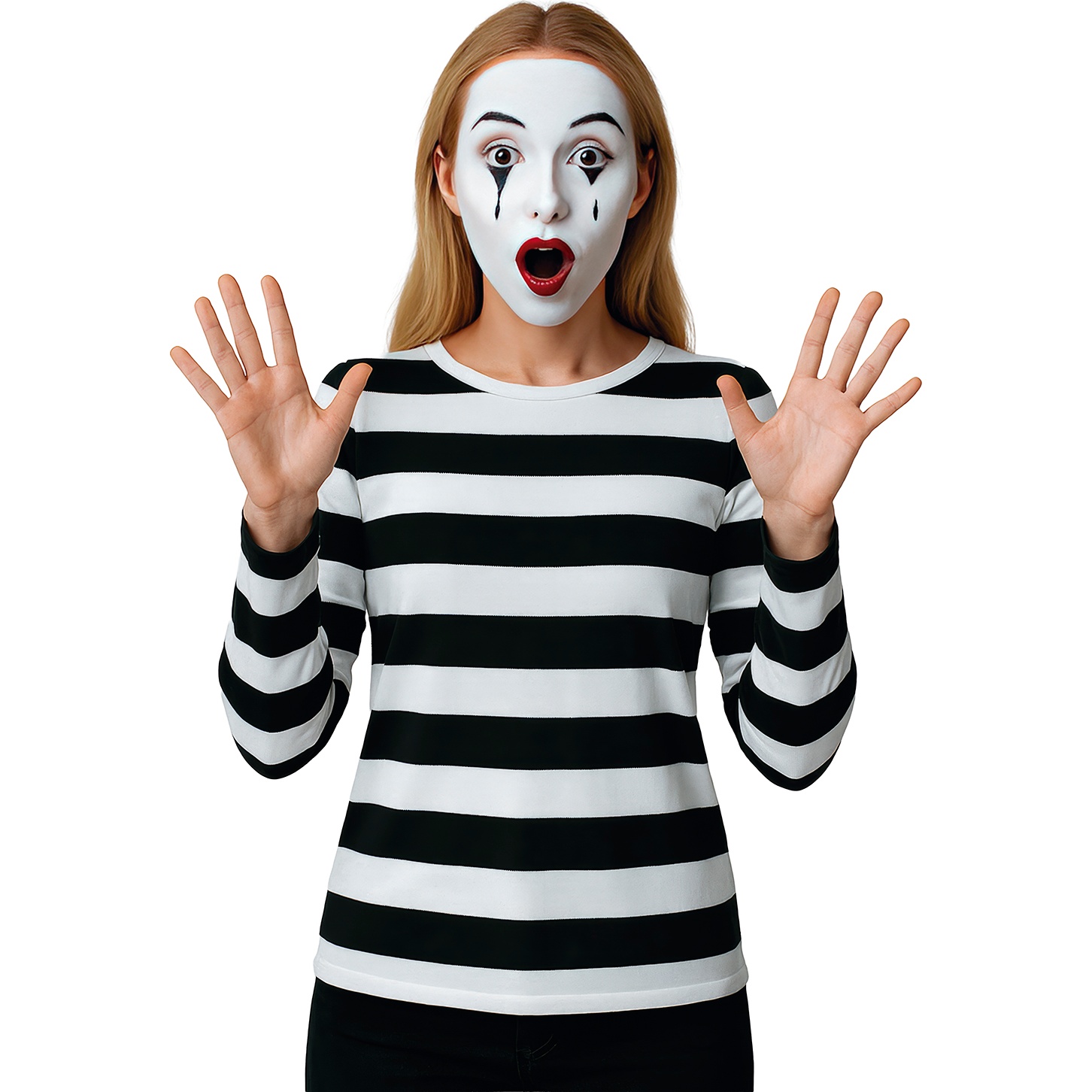 T-shirt à rayures horizontales noir et blanc, conçu pour vous permettre d'adopter le look classique du mime. Sa coupe droite et ses manches longues lui confèrent un rendu intemporel et facile à associer. Confectionné en polyester, il offre légèreté et bonne tenue, parfait pour vos événements et vos représentations. Idéal comme pièce maîtresse d'un costume thématique ou comme complément de votre garde-robe de scène.