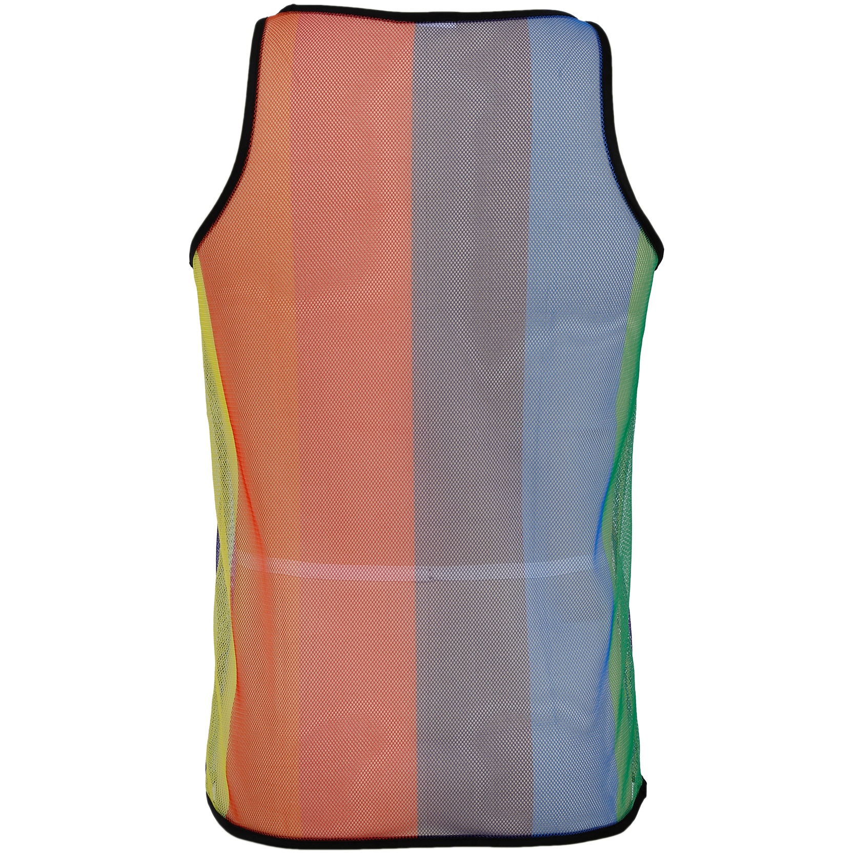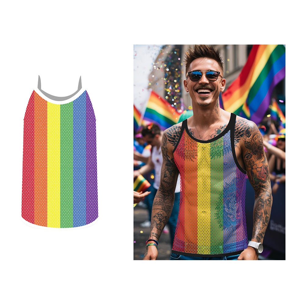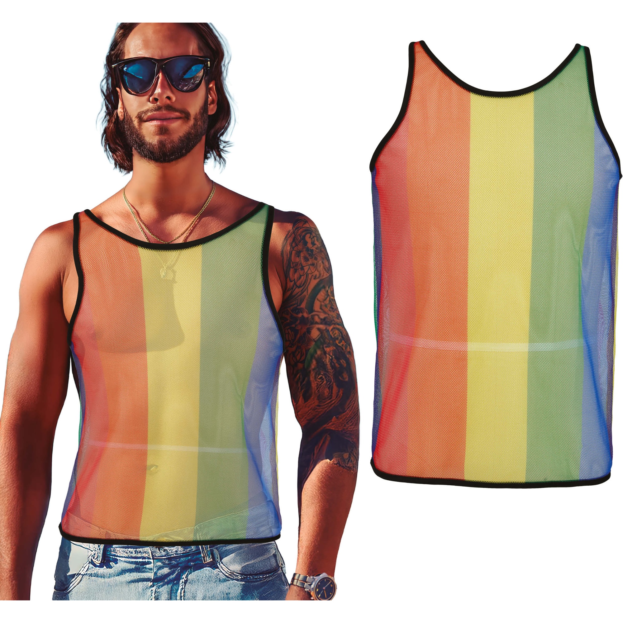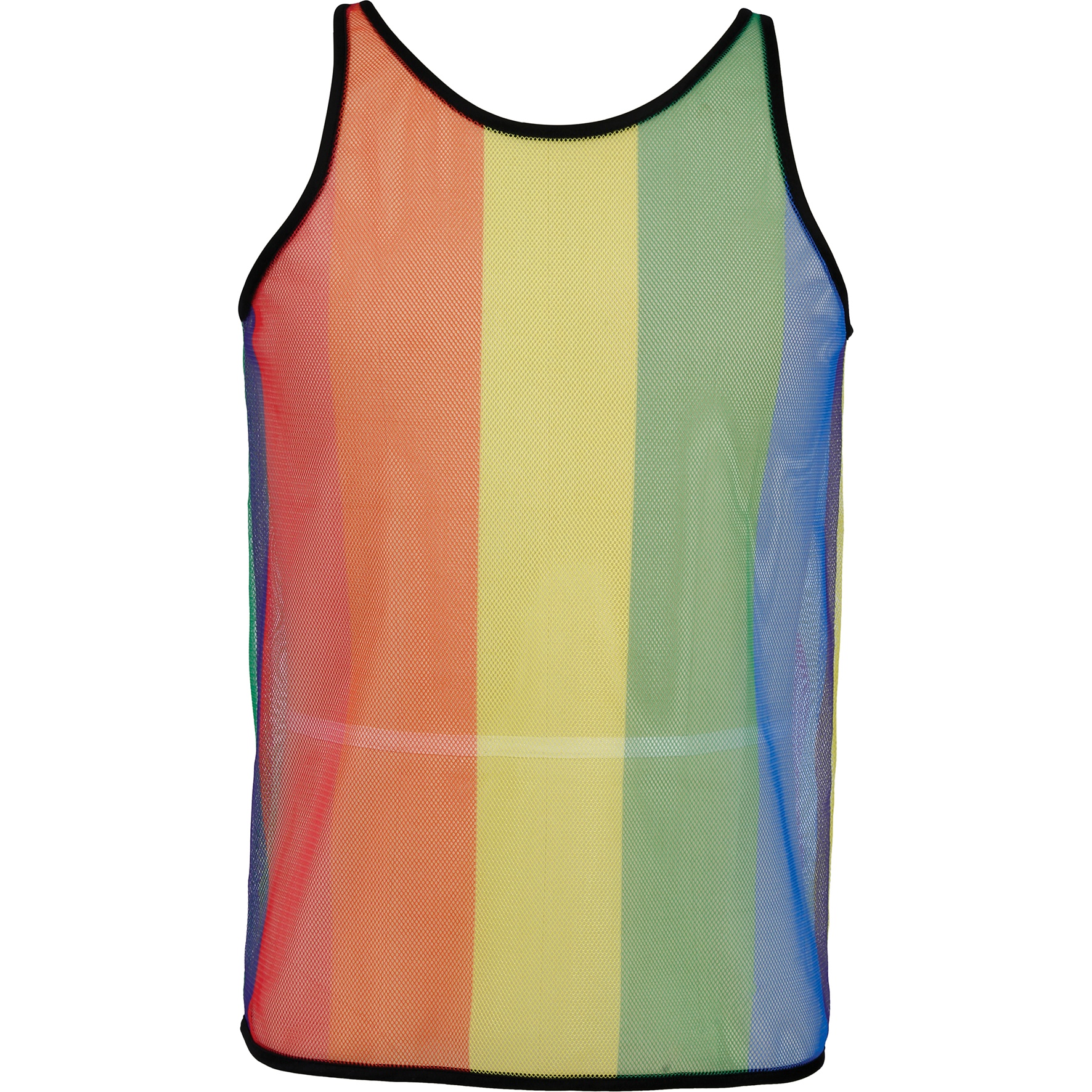 T-shirt en résille aux bandes arc?en?ciel, conçu pour vous faire remarquer lors des célébrations Pride et des défilés, avec finitions noires contrastées. La maille polyester offre une sensation légère et respirante, vous permettant de le porter seul ou en superposition sur d'autres vêtements. Sa coupe unisexe adulte s'adapte à différents styles et combinaisons. Un design éclatant et coloré pour composer des looks festifs et originaux.