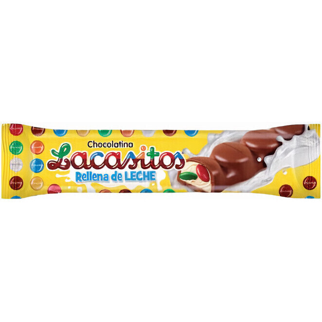 • Chocolat au lait (50 %) fourré à la crème de lait (38 %) avec des dragées de chocolat au lait enrobées de sucre coloré (12 %).