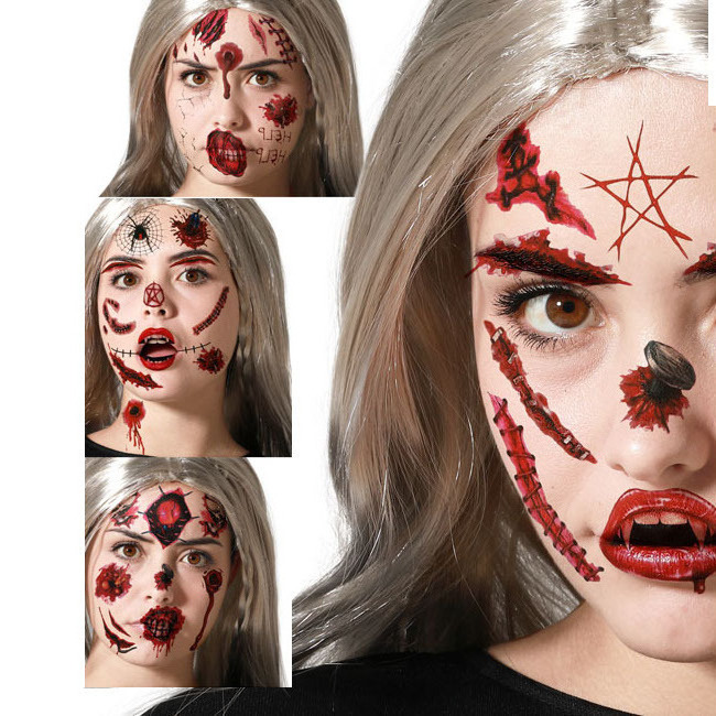 • Tatouages avec effets de blessures, symboles sataniques et marques sanglantes. Idéal pour des déguisements de zombie, sorcière, démon ou victime d'horreur.