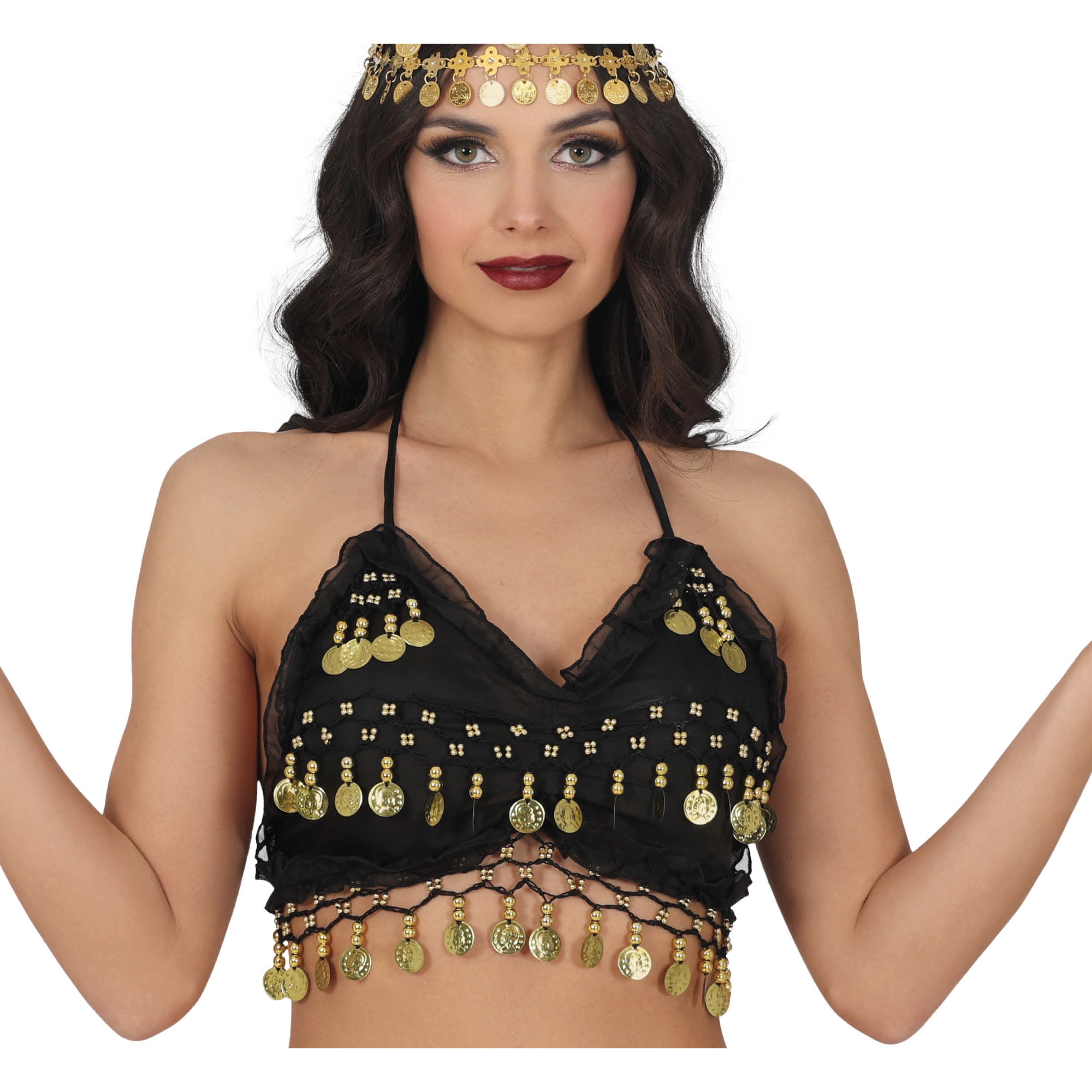 Top noir à pièces conçu pour la danse orientale professionnelle et les représentations. Il apporte éclat et mouvement grâce à des rangées de pièces métalliques qui tintent à chaque pivot, mettant en valeur la chorégraphie. Coupe flatteuse avec décolleté en V et bretelles réglables assurant un maintien confortable et sûr. Parfait pour les shows, les cours, les fêtes à thème et le Carnaval, il se marie facilement avec jupes, ceintures ou accessoires orientaux pour compléter votre tenue.