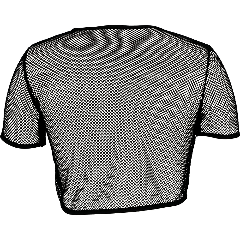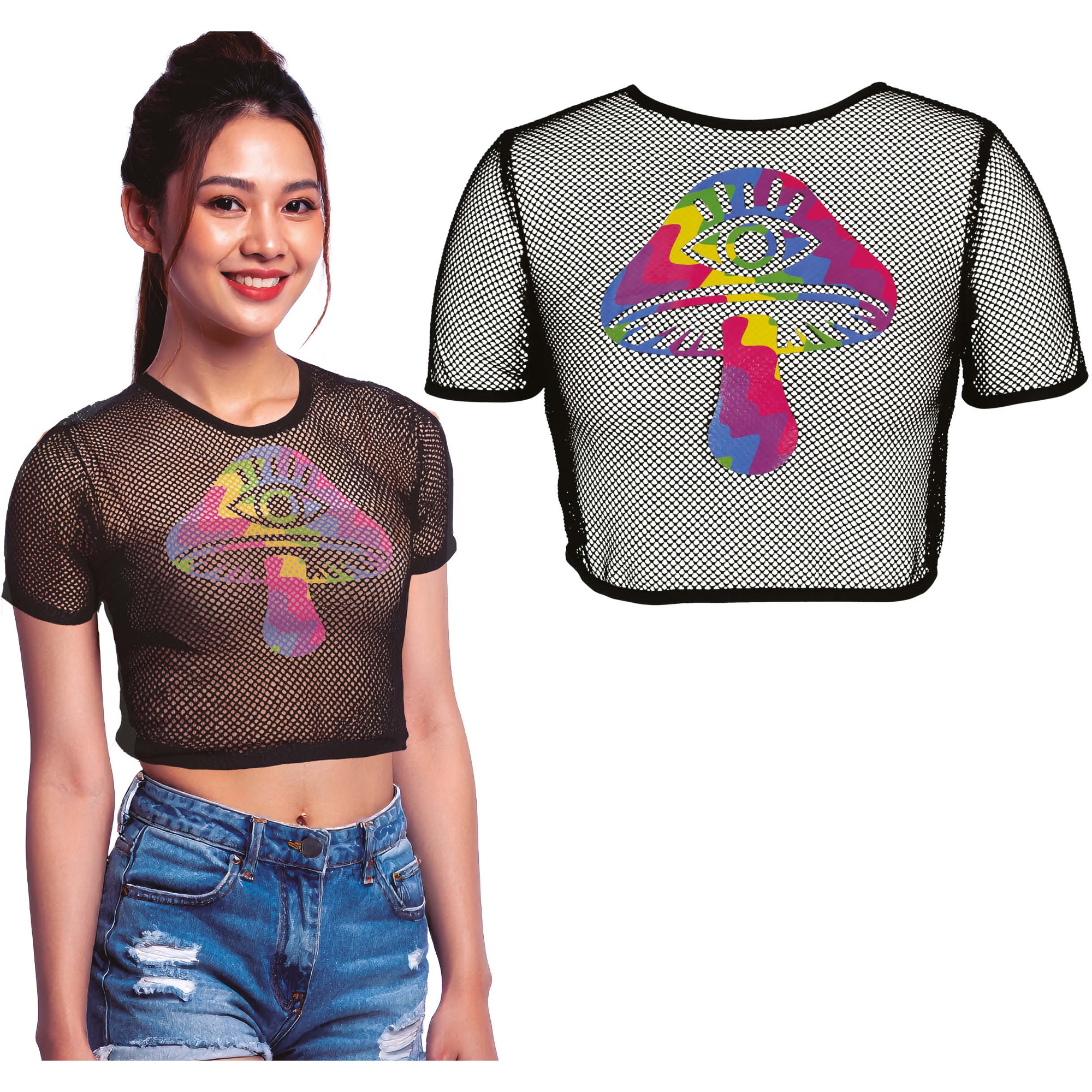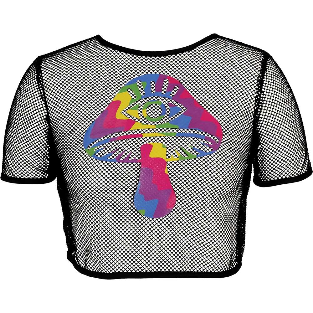 Top court en résille avec un imprimé champignon psychédélique vibrant sur le devant.