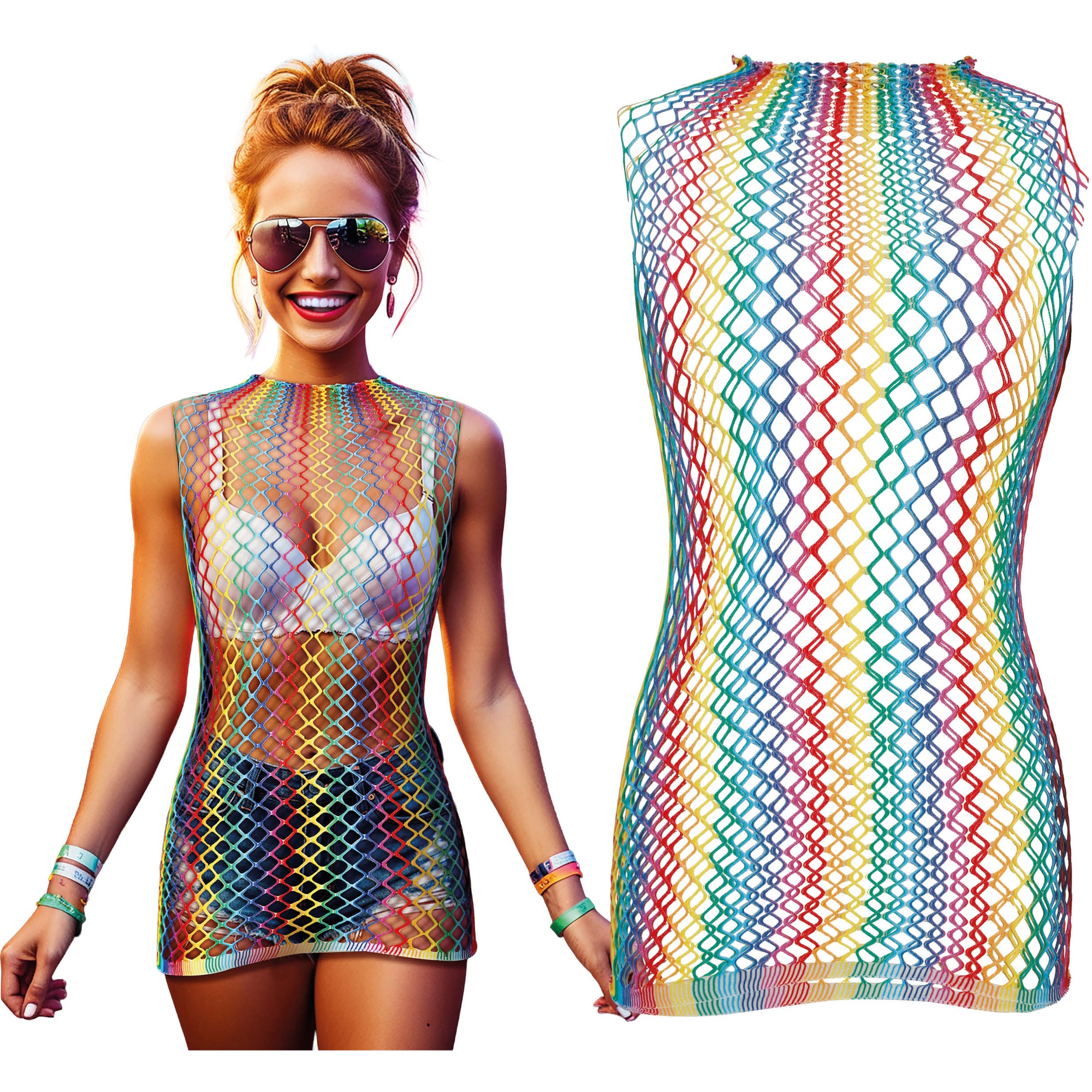 Top en résille multicolore conçu pour vous faire remarquer lors de festivals, raves et événements nocturnes. Sa maille large et ses couleurs vives offrent un rendu saisissant, parfait à porter sur un bikini, une bralette ou un top. Coupe ajustée et extensible qui valorise la silhouette sans gêner les mouvements. Vêtement léger et respirant pensé pour des looks audacieux et pleins de couleur.