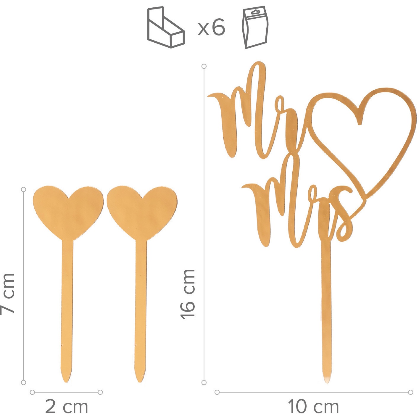 Toppers pour gâteau "Mr and Mrs" et coeurs - 3 unités